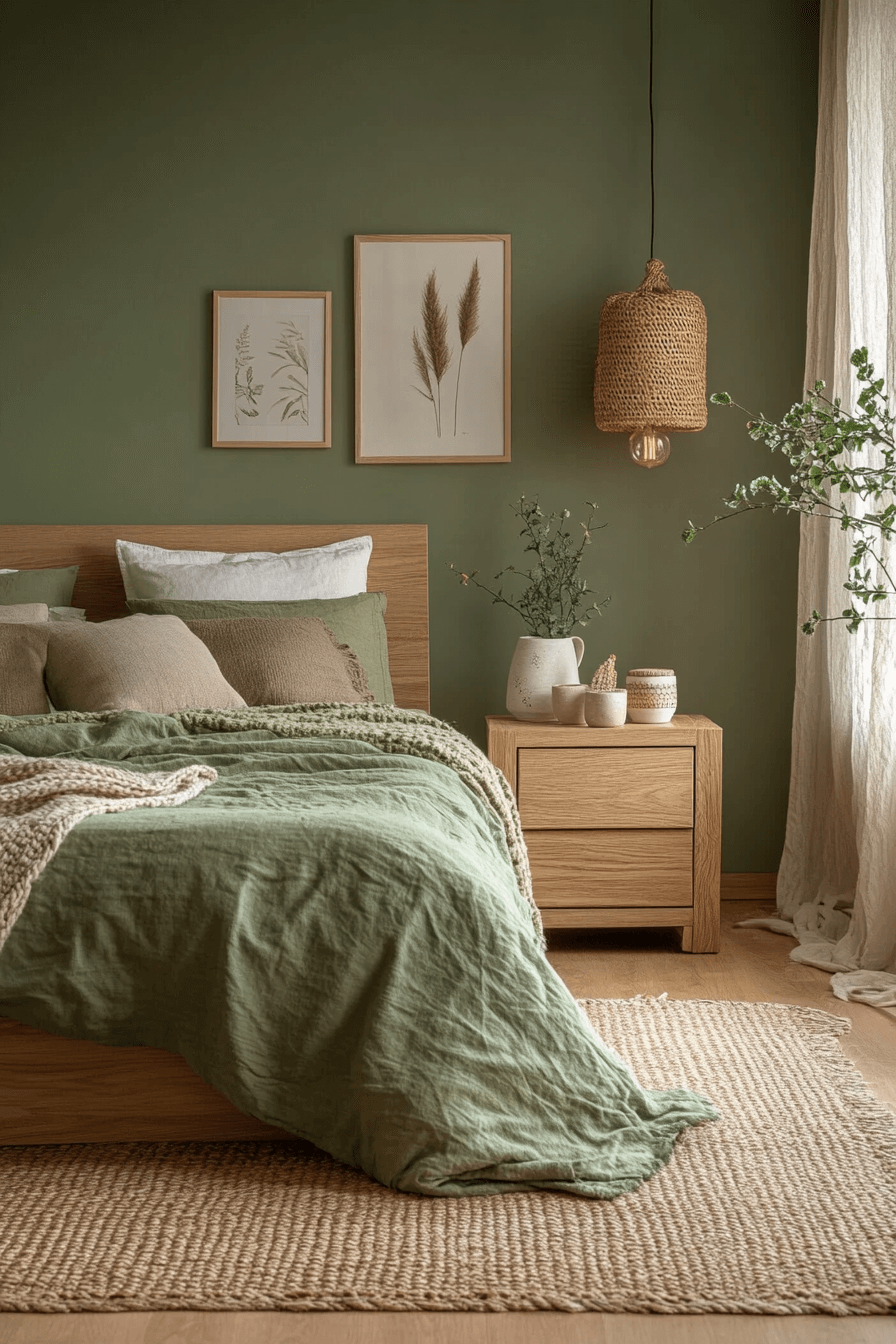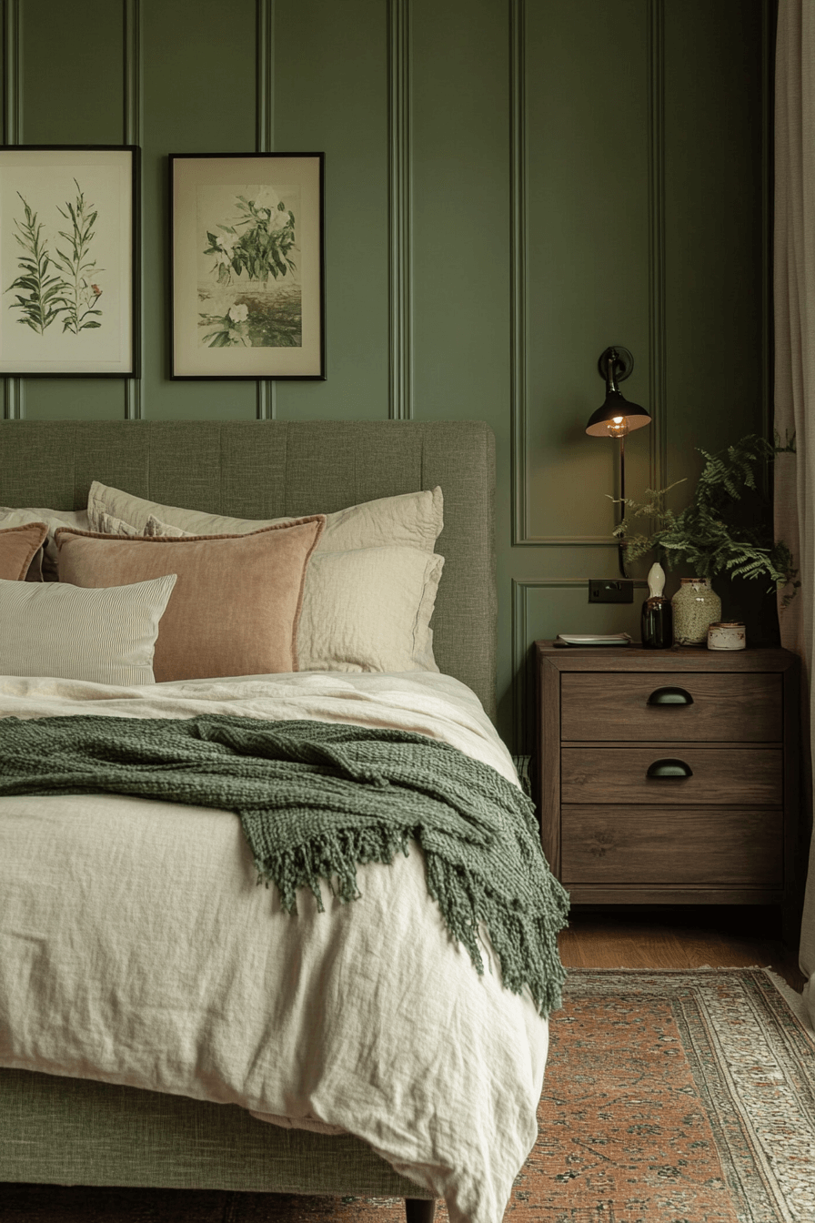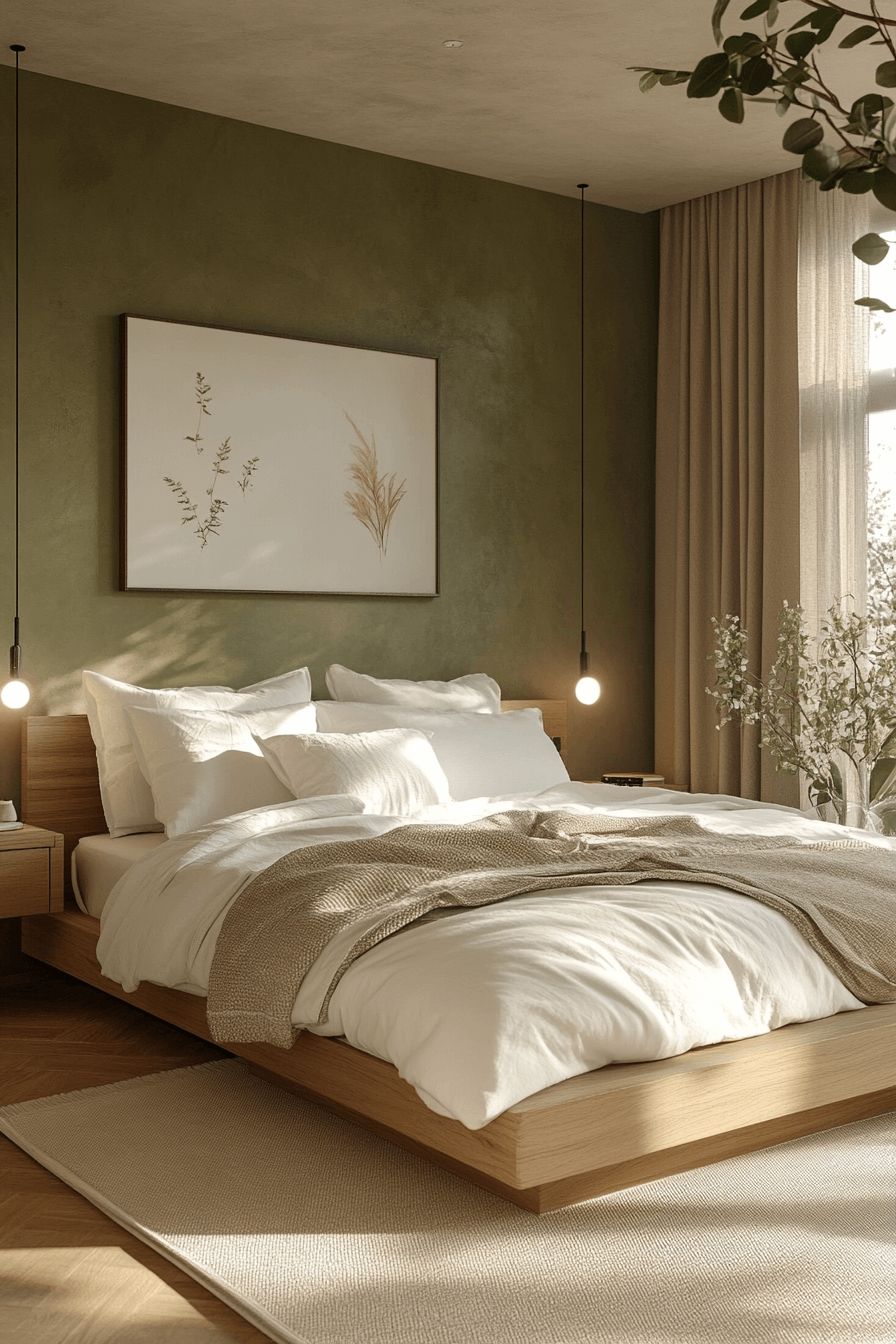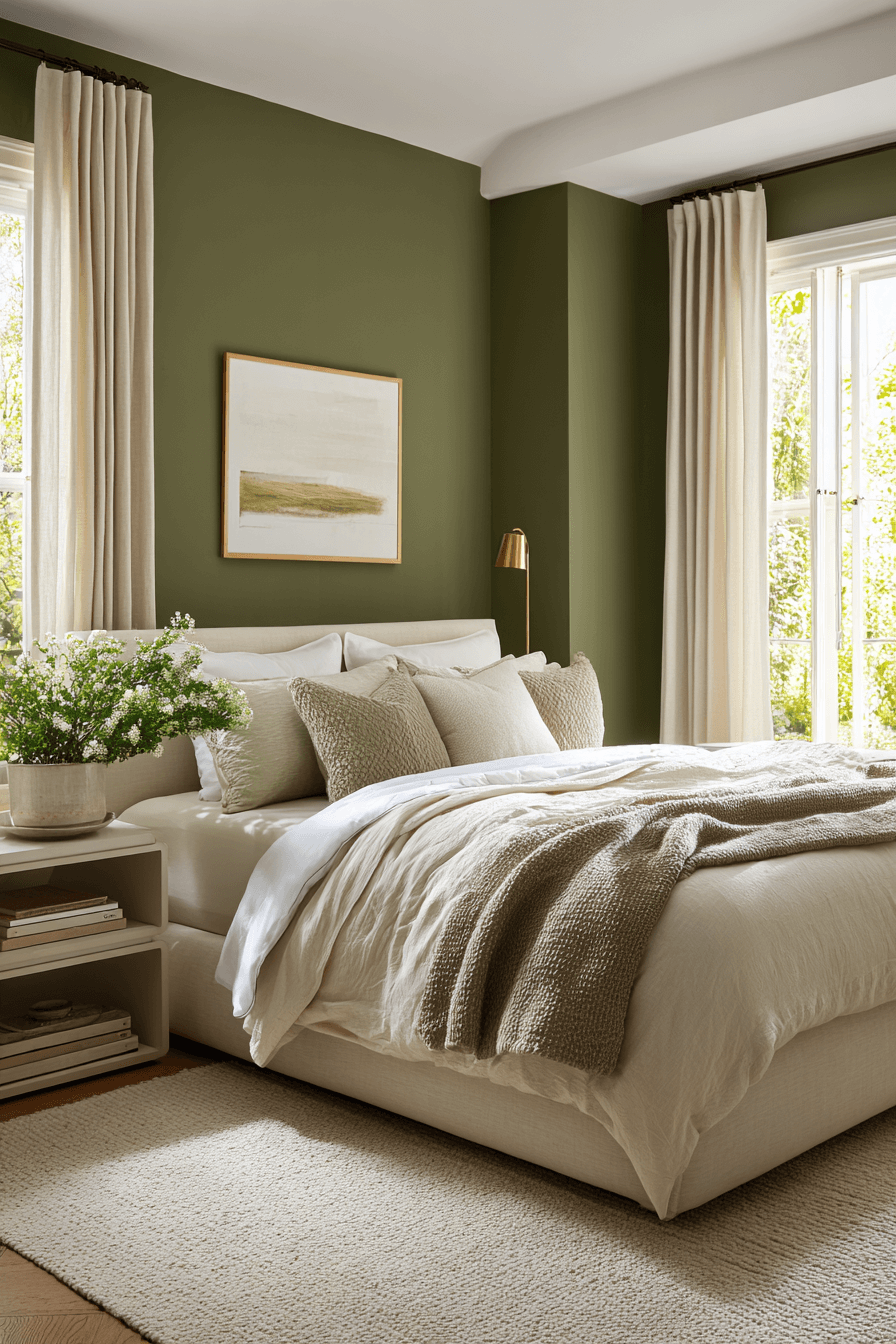 Airy neutrals paired with olive green bedroom walls maintain openness and warmth. Light bedding and minimal decor balance the richness of the paint. Natural light enhances the harmony beautifully. Olive adds depth without dominating the space. The overall mood feels fresh and welcoming. Keep your green bedroom light and breezy now.