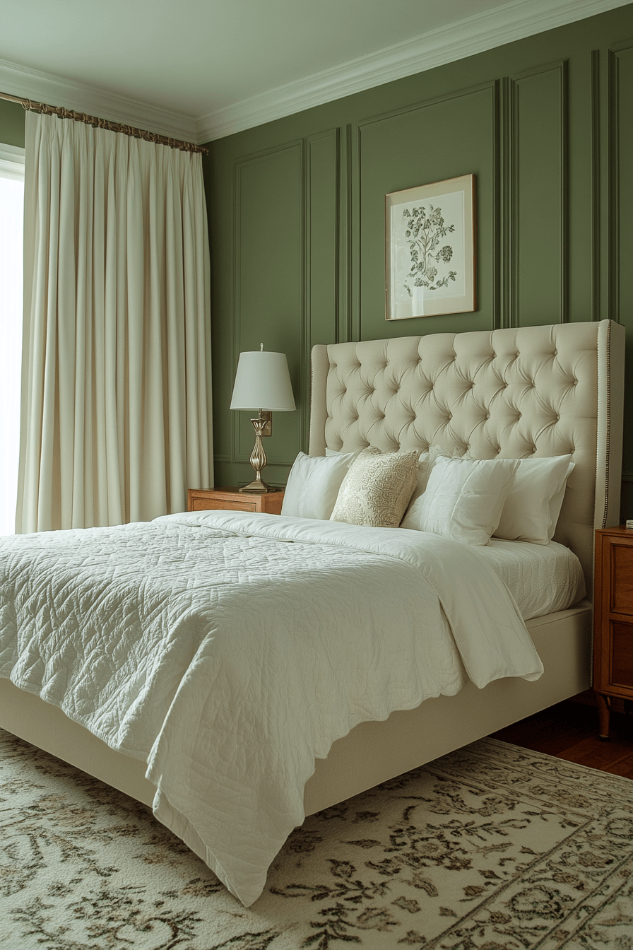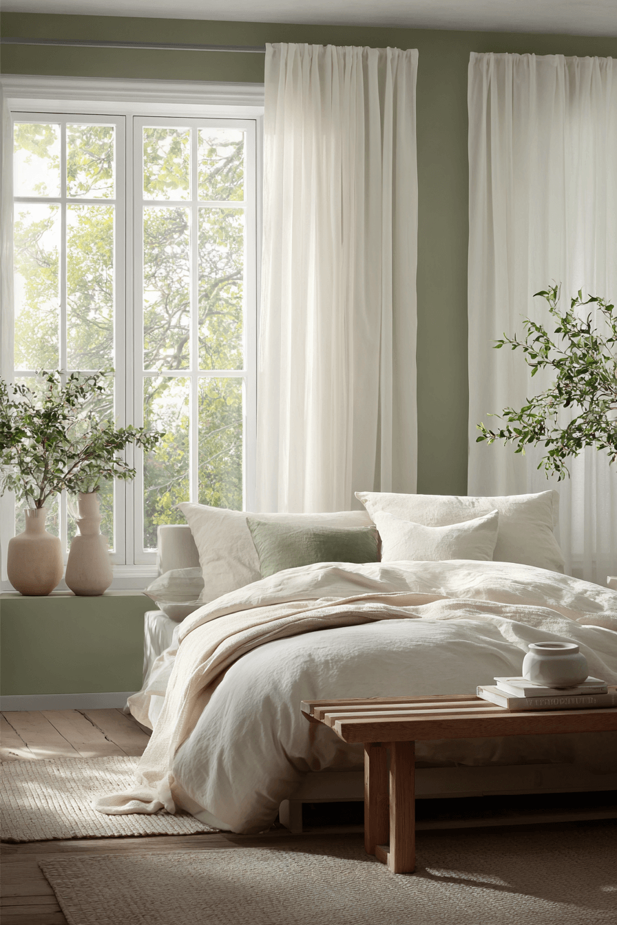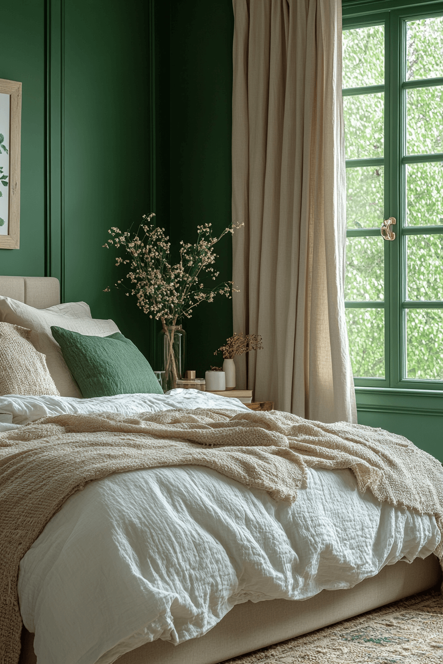 Airy neutrals paired with olive green bedroom walls maintain openness and warmth. Light bedding and minimal decor balance the richness of the paint. Natural light enhances the harmony beautifully. Olive adds depth without dominating the space. The overall mood feels fresh and welcoming. Keep your green bedroom light and breezy now.