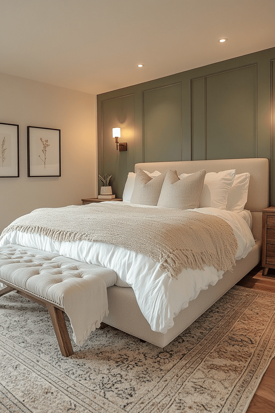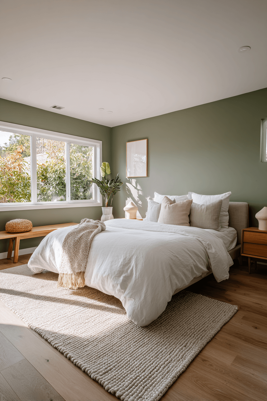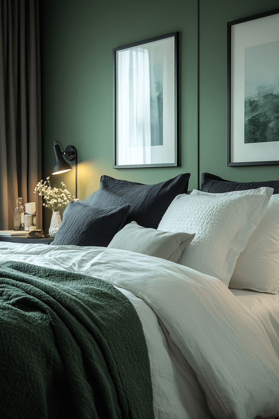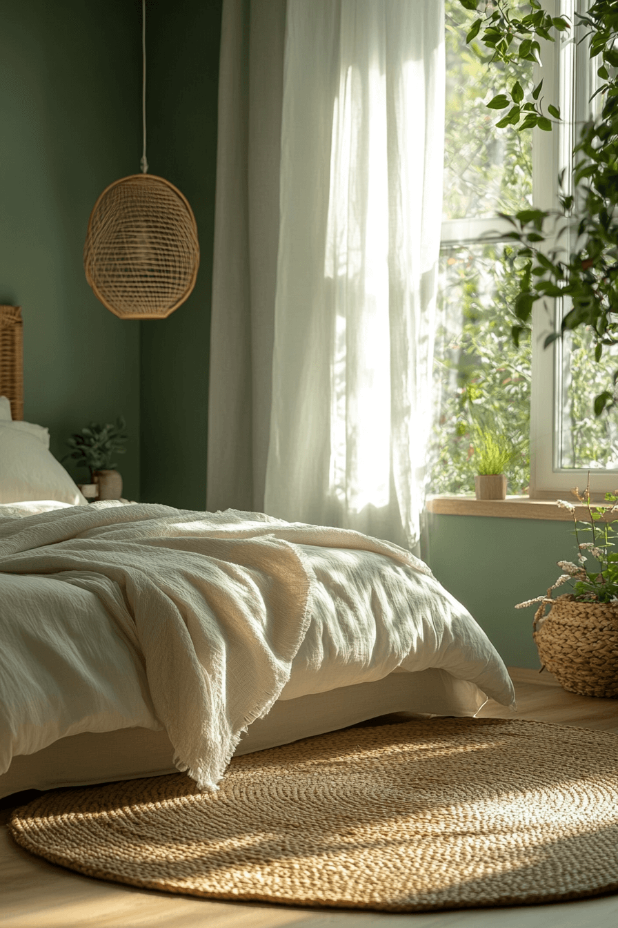 Airy neutrals paired with olive green bedroom walls maintain openness and warmth. Light bedding and minimal decor balance the richness of the paint. Natural light enhances the harmony beautifully. Olive adds depth without dominating the space. The overall mood feels fresh and welcoming. Keep your green bedroom light and breezy now.