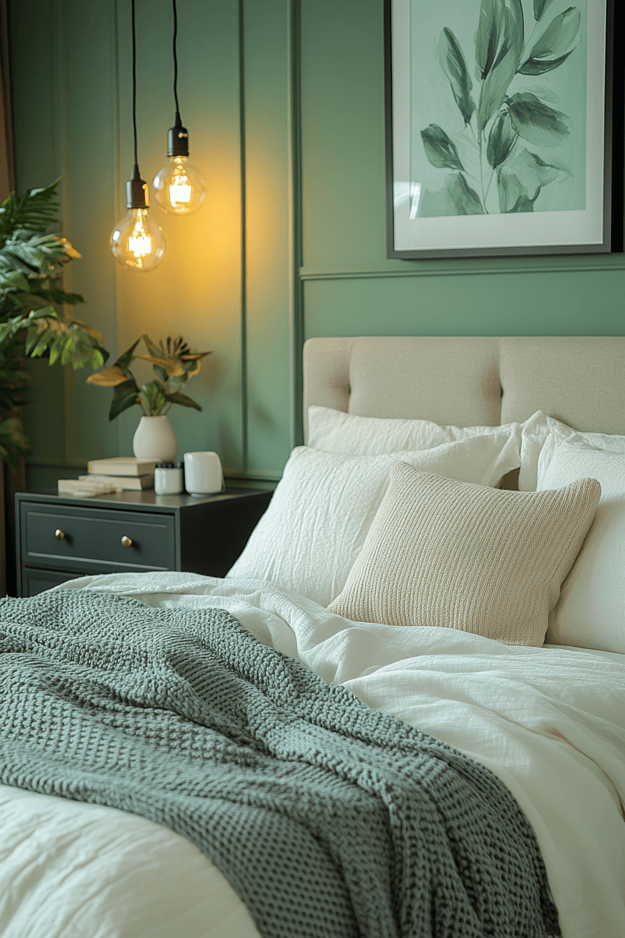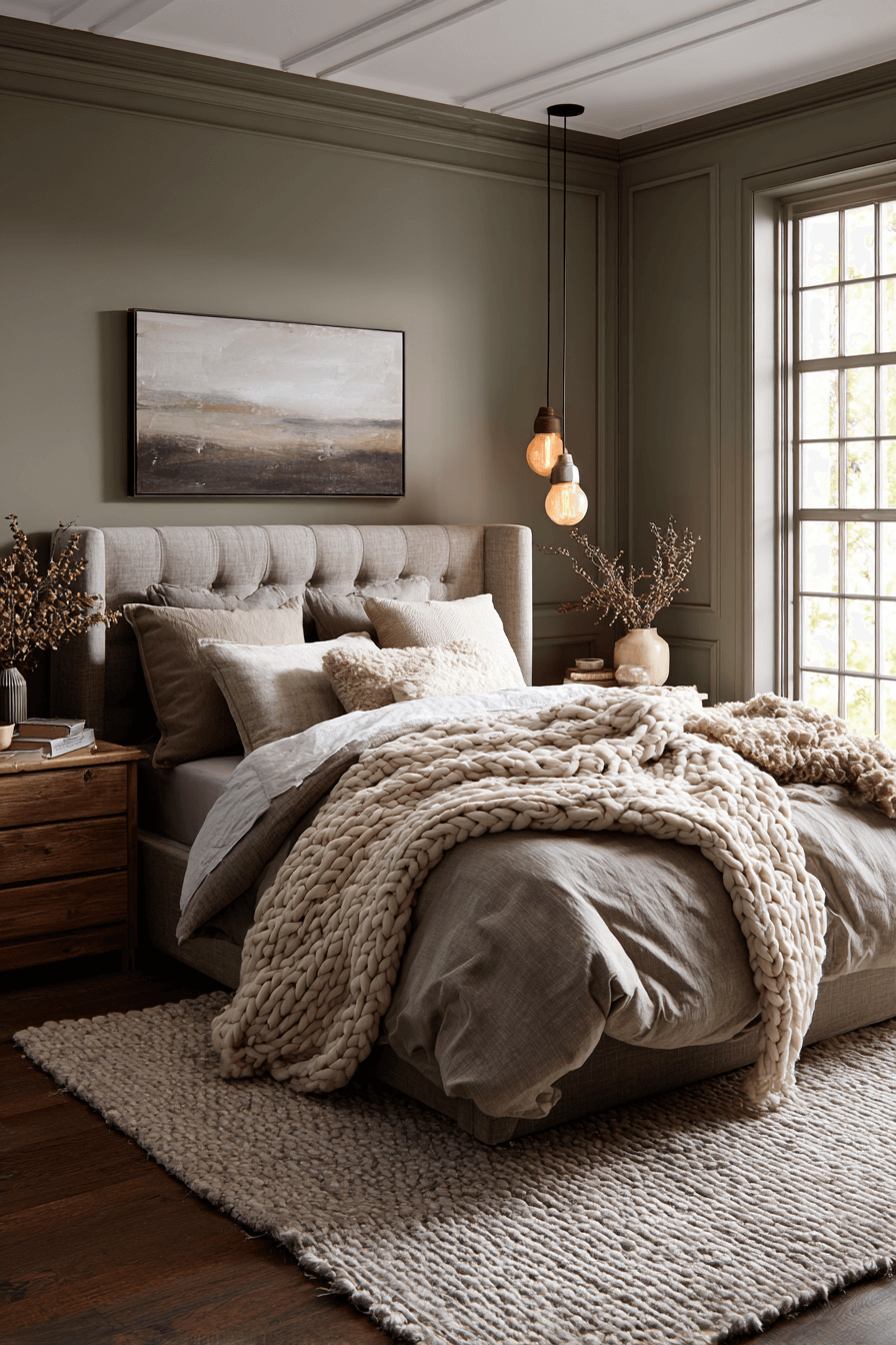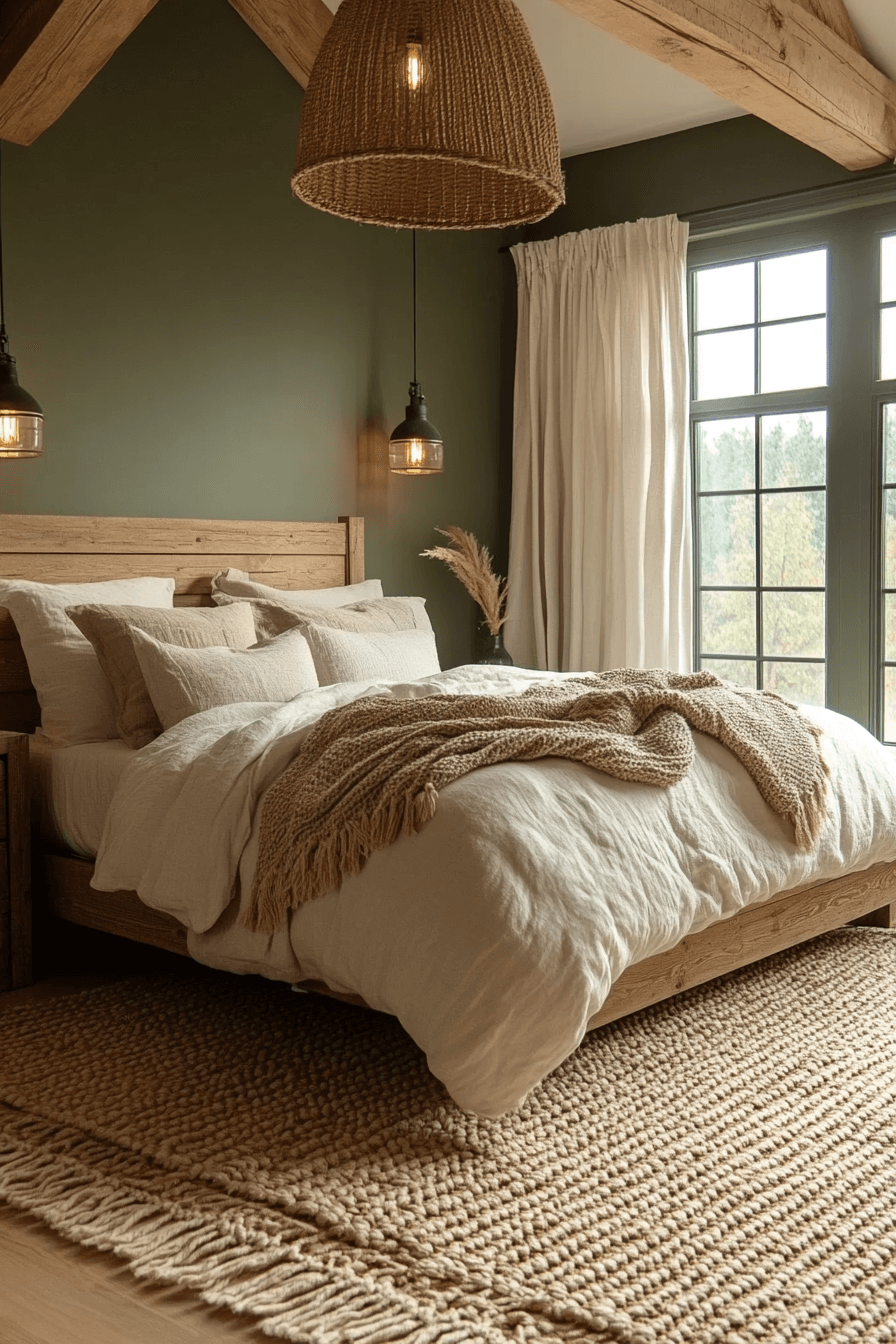 Rustic textures blended with olive green bedroom walls create a warm modern balance. Reclaimed wood and matte metals complement the earthy tone. Olive softens industrial elements effortlessly. The mix feels grounded yet fresh. Cozy fabrics complete the layered aesthetic. Explore this rustic modern combination now.