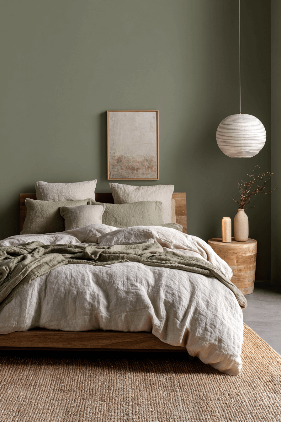Linen bedding layered into an olive green bedroom creates effortless relaxation. The natural texture softens the richness of the walls. Warm white accents maintain cohesion. The space feels breathable and organic. Olive benefits from linen’s casual elegance beautifully. Style your bedroom with this relaxed pairing today.