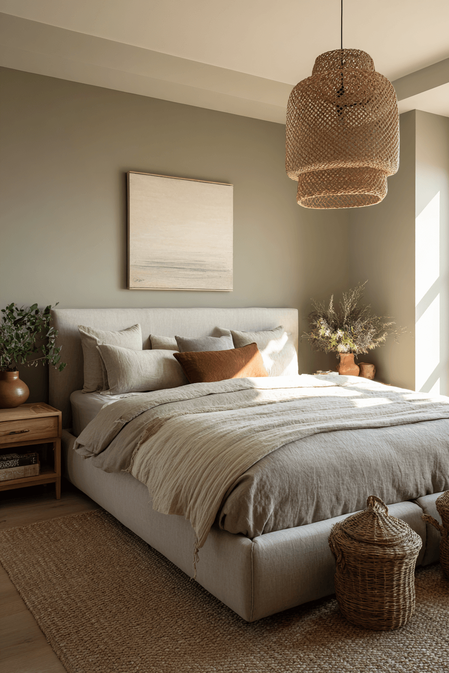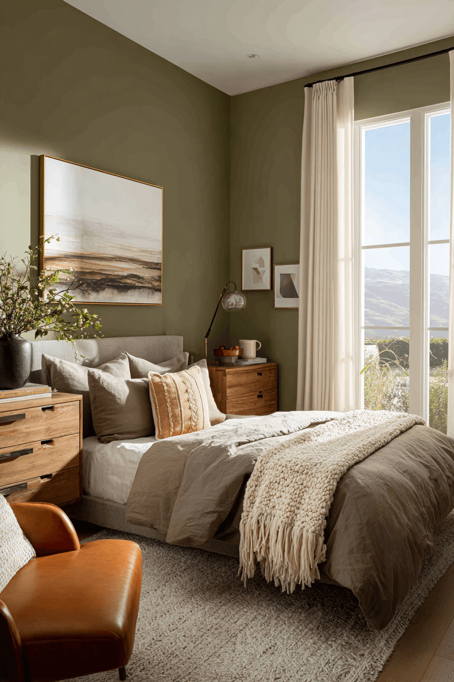 Blending sandy neutrals with olive green bedroom walls creates a beautifully layered atmosphere. Taupe bedding, woven rugs, and caramel accents soften the richness of the green. Olive acts as the anchor while warm tones bring balance and warmth. The overall look feels grounded yet inviting. Textural details tie everything together seamlessly. Style your space with this welcoming color combination today.