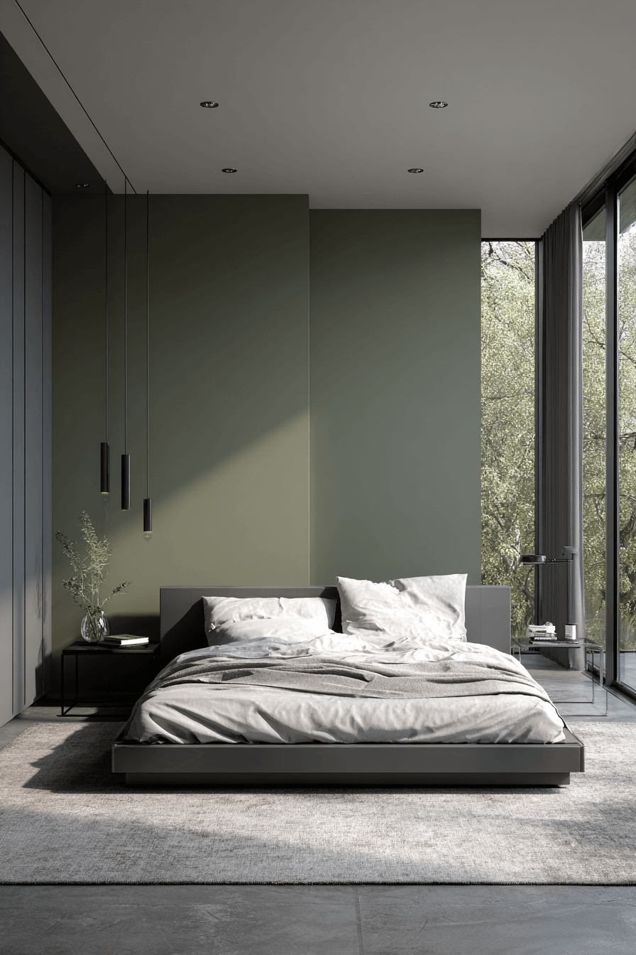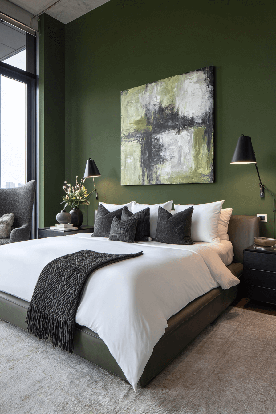 Clean lines paired with olive green bedroom walls create a modern space filled with warmth. Streamlined furniture allows the color to shine without distraction. Subtle metallic accents add polish while maintaining simplicity. Olive provides bold character without cluttering the design. A tight palette of black, white, and warm metals completes the look. Master this modern calm in your bedroom today.