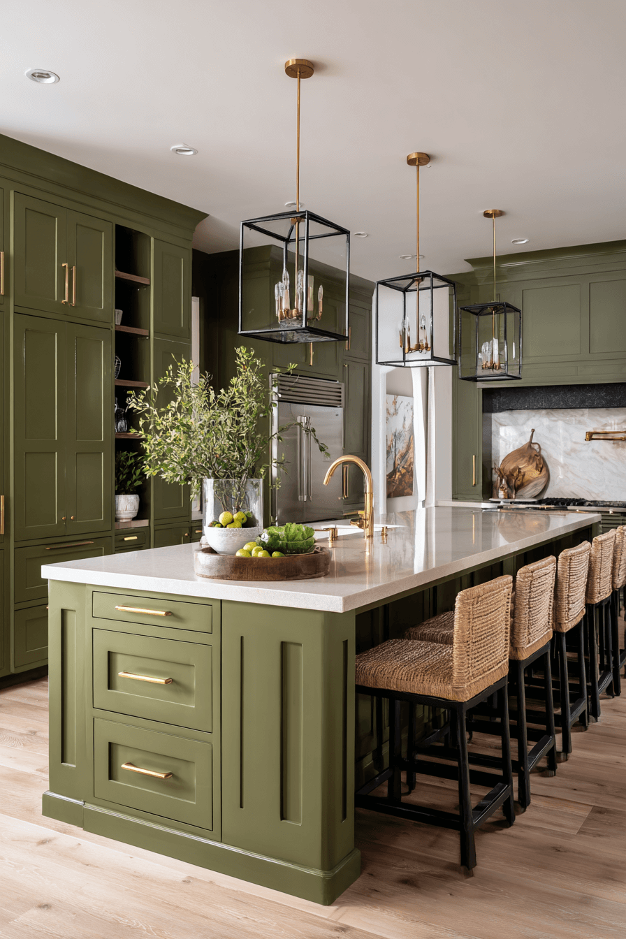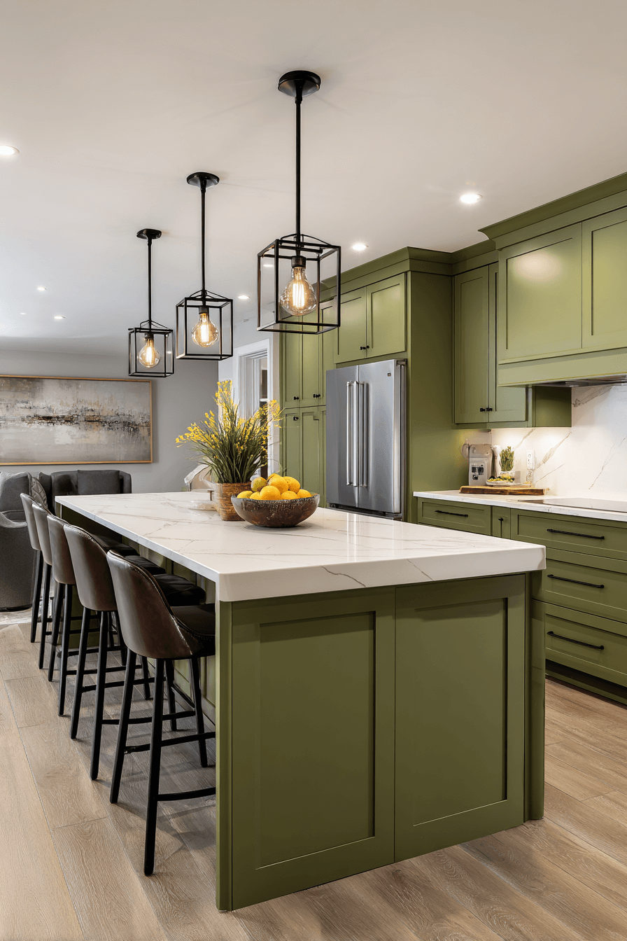 A statement island painted olive can anchor an olive green kitchen with bold personality. Keeping surrounding cabinetry lighter prevents the space from feeling too dark. Modern pendant lighting above enhances the focal point. The contrast creates dimension without clutter. Olive naturally draws the eye in this setting. Make your island the star of the kitchen today.