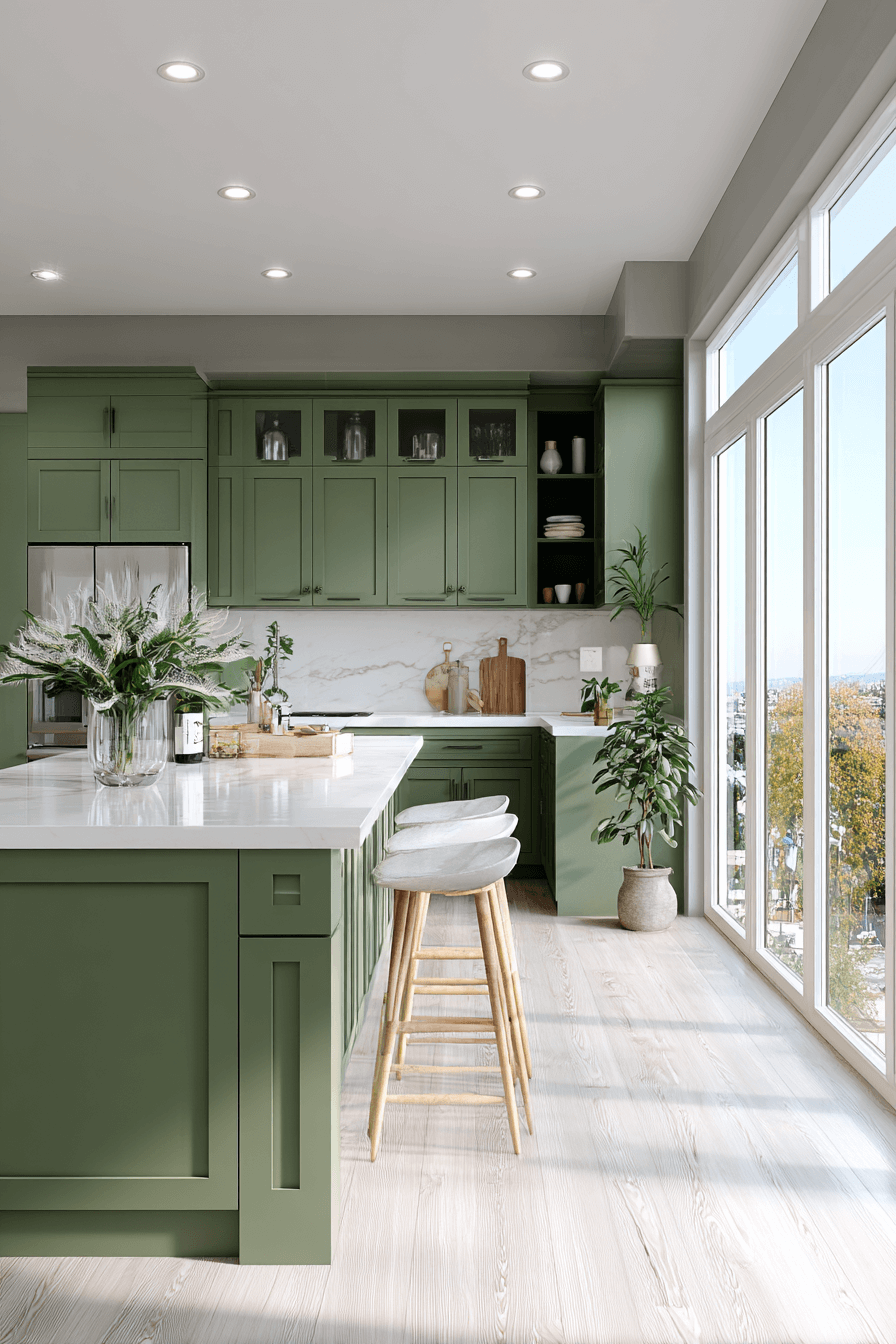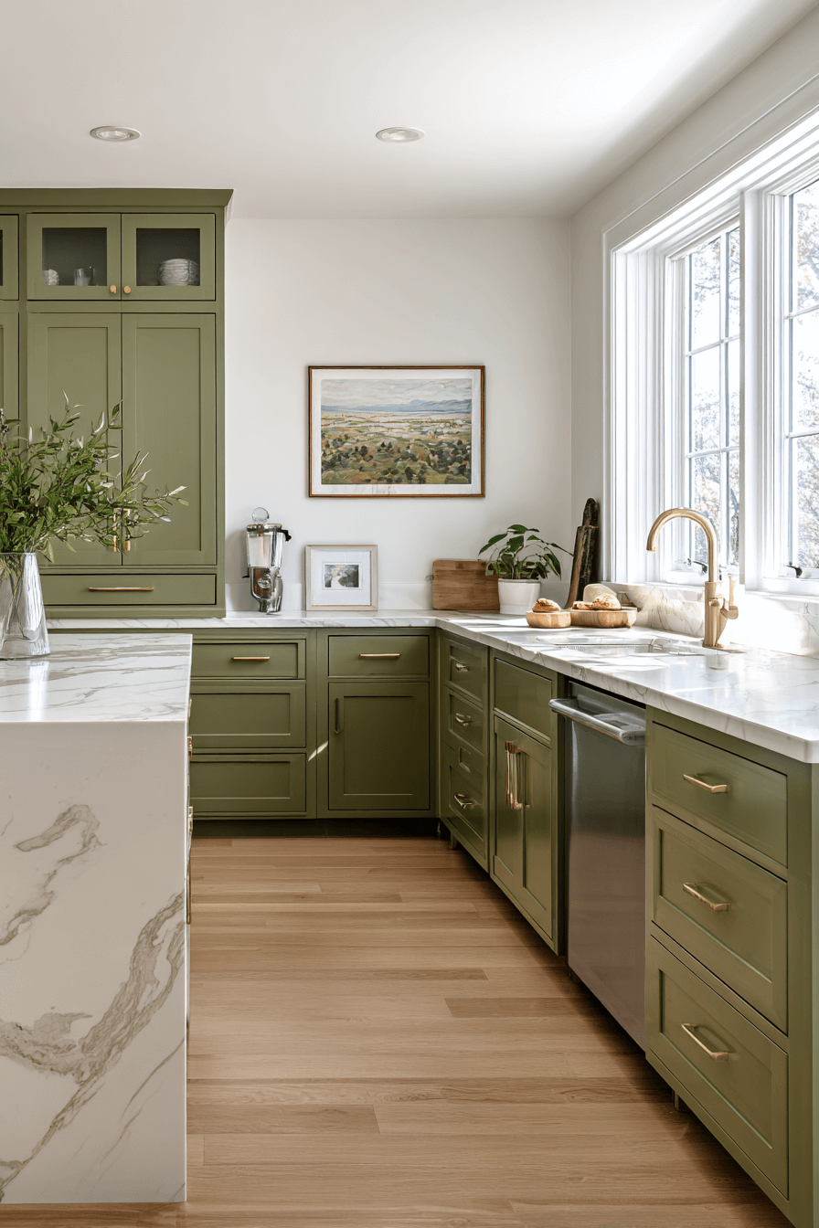 Sunlight streaming into an olive green kitchen enhances the subtle golden undertones in the cabinets. White countertops brighten the richness of the paint. Natural light prevents the space from feeling heavy. The contrast creates an open, welcoming vibe. Minimal decor keeps the look fresh. Let natural light elevate your olive kitchen now.