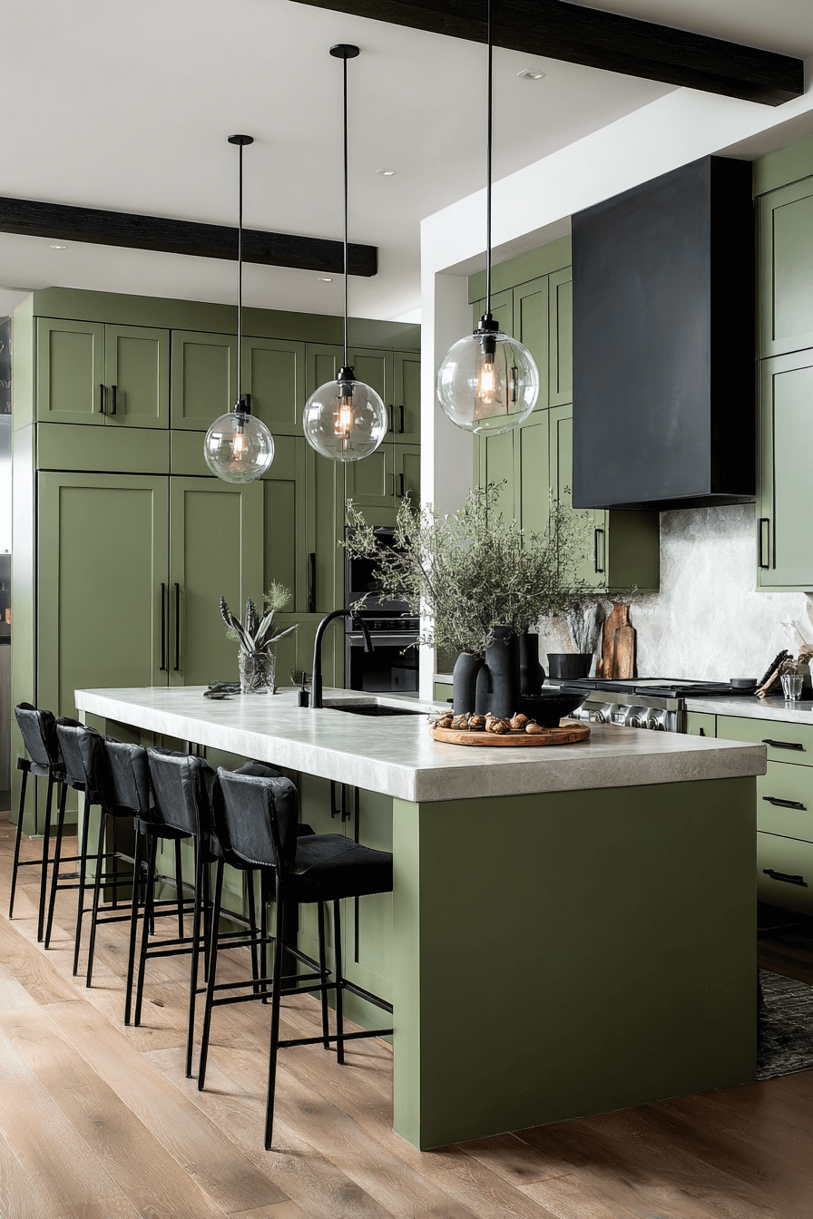 Black accents paired with an olive green kitchen create bold structure and definition. Matte black faucets and hardware pop beautifully against the green. Olive softens the intensity of darker finishes. Light countertops maintain balance throughout the room. The look feels modern and striking. Explore this edgy olive combination today.