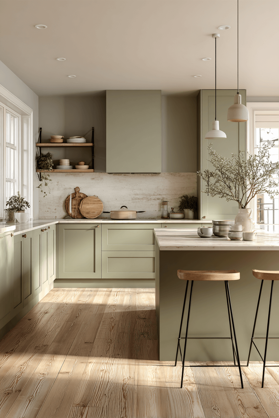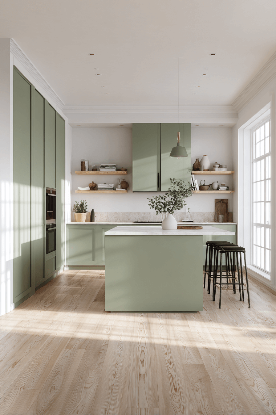 Light wood flooring and crisp walls make an olive green kitchen feel Scandinavian inspired and fresh. The green adds personality while maintaining simplicity. Soft lighting keeps the space cozy. Minimal decor enhances the clean aesthetic. The blend feels airy and inviting. Bring Nordic inspired olive style into your kitchen now.