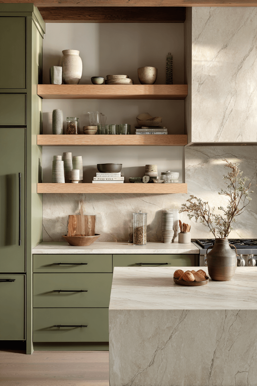Open shelving within an olive green kitchen introduces visual lightness and character. Floating shelves break up solid cabinetry beautifully. Olive provides a rich backdrop for ceramics and glassware. Organized displays keep the design refined. The mix feels approachable and stylish. Style your olive kitchen shelves with confidence today.