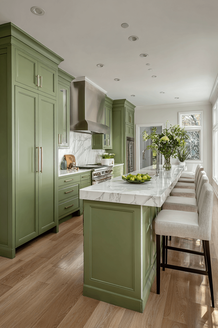Quartz surfaces pair beautifully with an olive green kitchen for a sleek, durable finish. Light quartz brightens the cabinetry without overpowering it. The smooth texture contrasts perfectly with the depth of olive. Simple bar stools complete the streamlined look. The design feels both practical and elegant. Discover this smart olive and quartz pairing today.