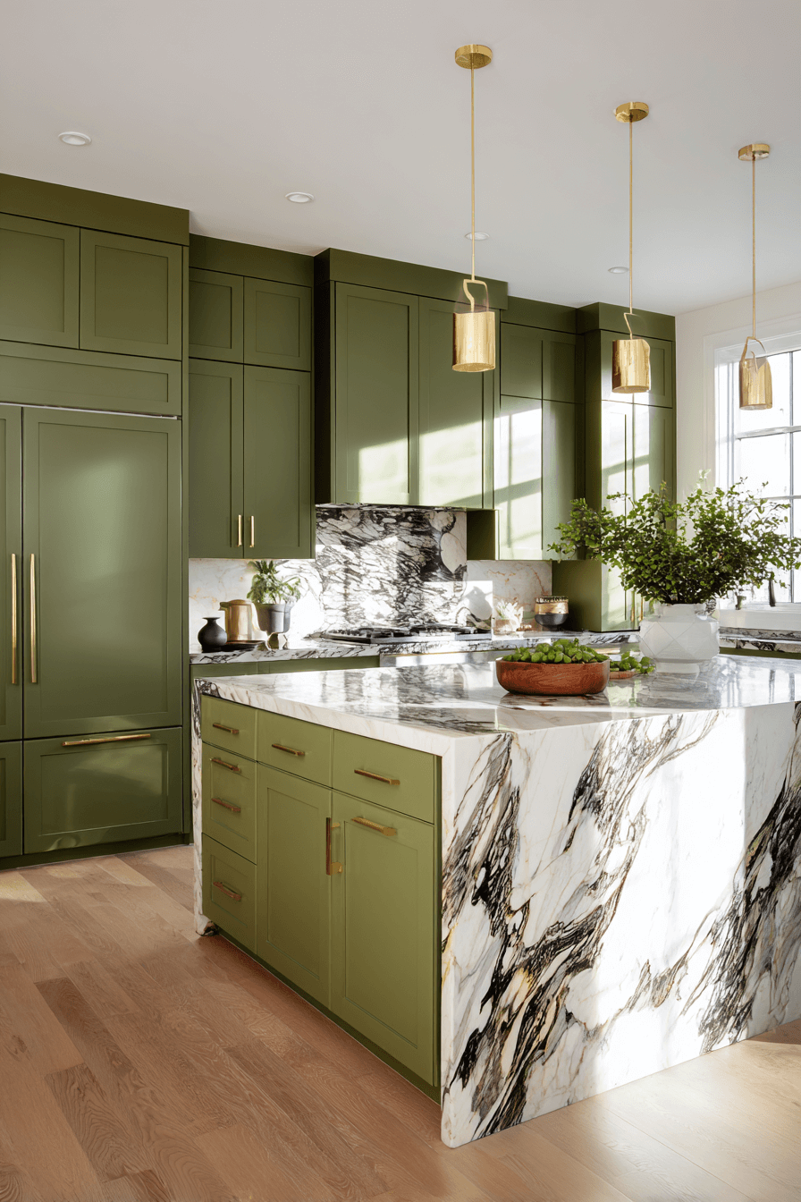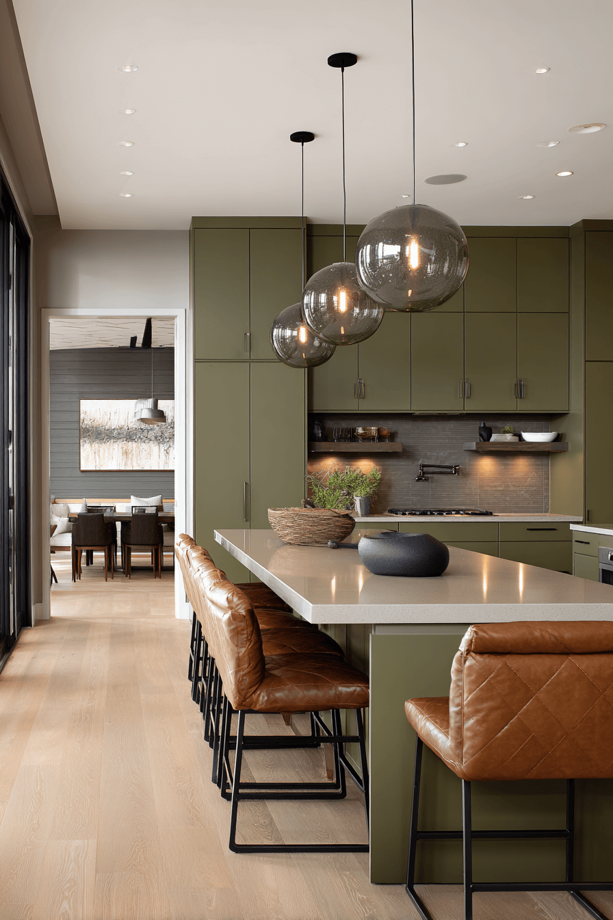 Sculptural lighting transforms an olive green kitchen into a curated design statement. Statement pendants add personality and contrast beautifully against green cabinets. Olive provides grounding depth for dramatic fixtures. Keeping the layout streamlined ensures balance. The effect feels stylish and intentional. Upgrade your olive kitchen with bold lighting today.