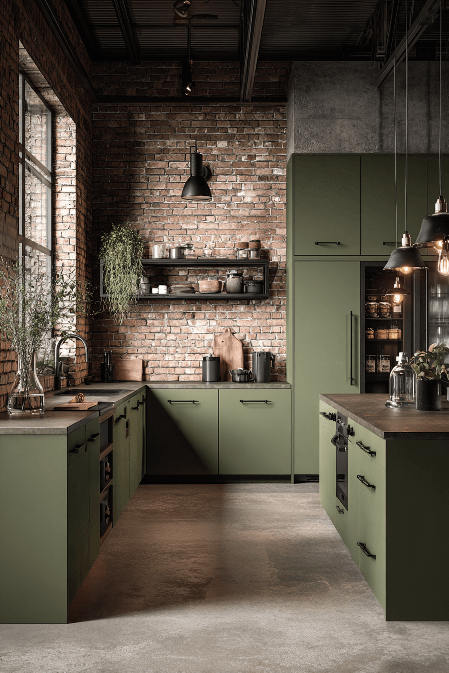 Industrial elements blend seamlessly with an olive green kitchen aesthetic. Exposed brick and matte metals gain warmth from the earthy shade. Olive softens hard edges without losing character. Clean surfaces maintain balance. The style feels urban yet inviting. Explore industrial olive charm now.
