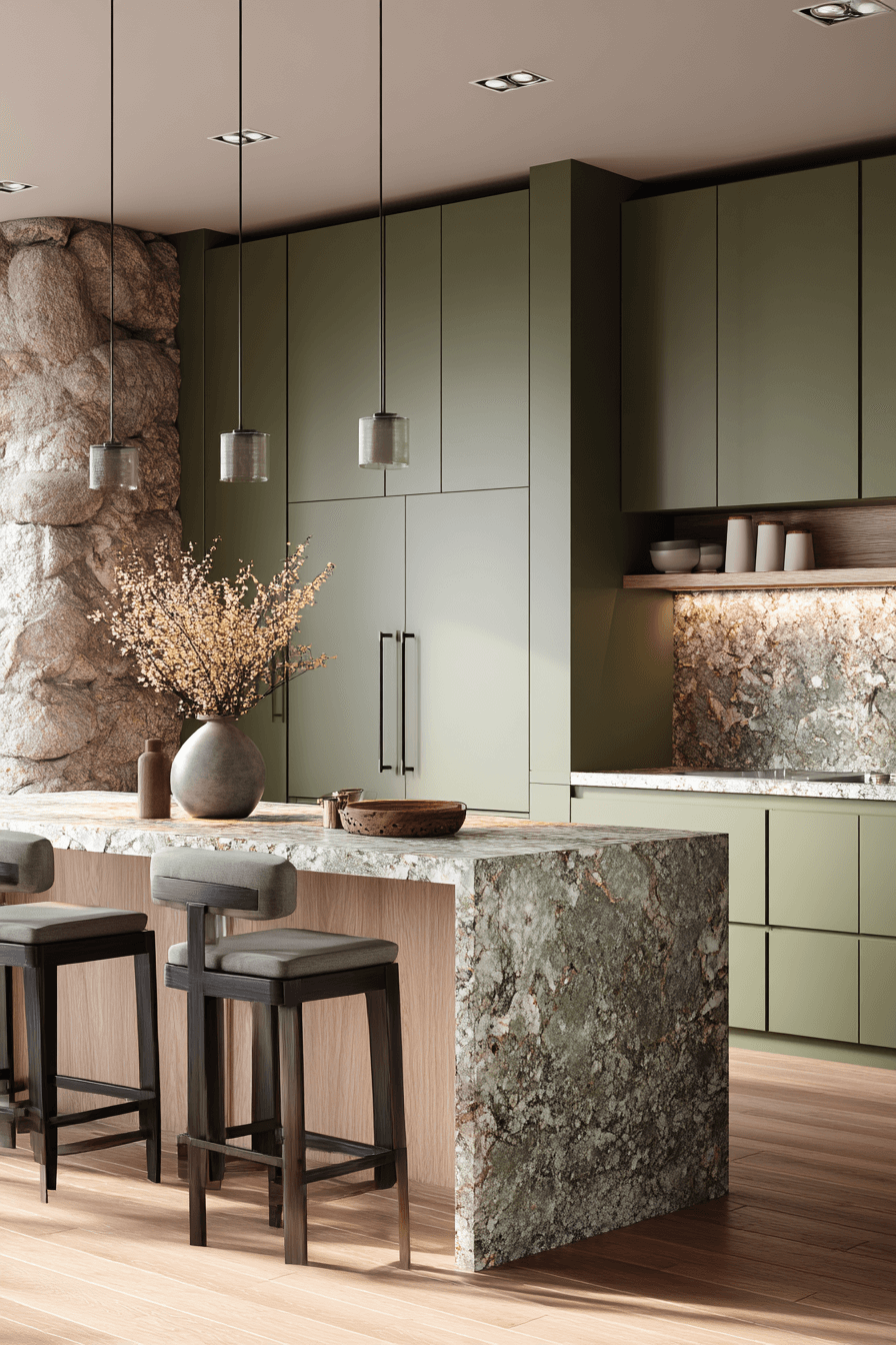 25. Olive Kitchen with Waterfall Edge Island