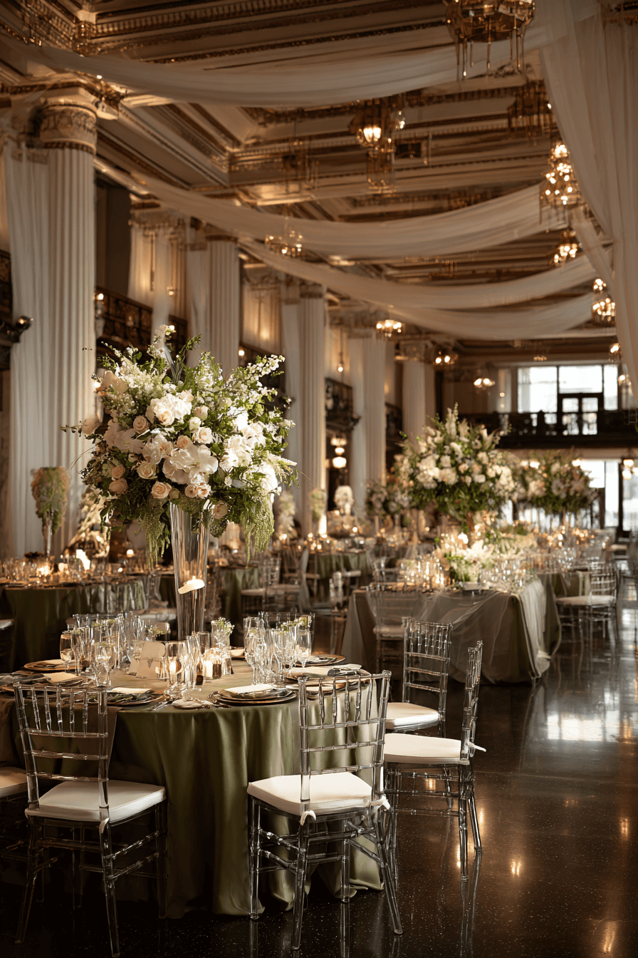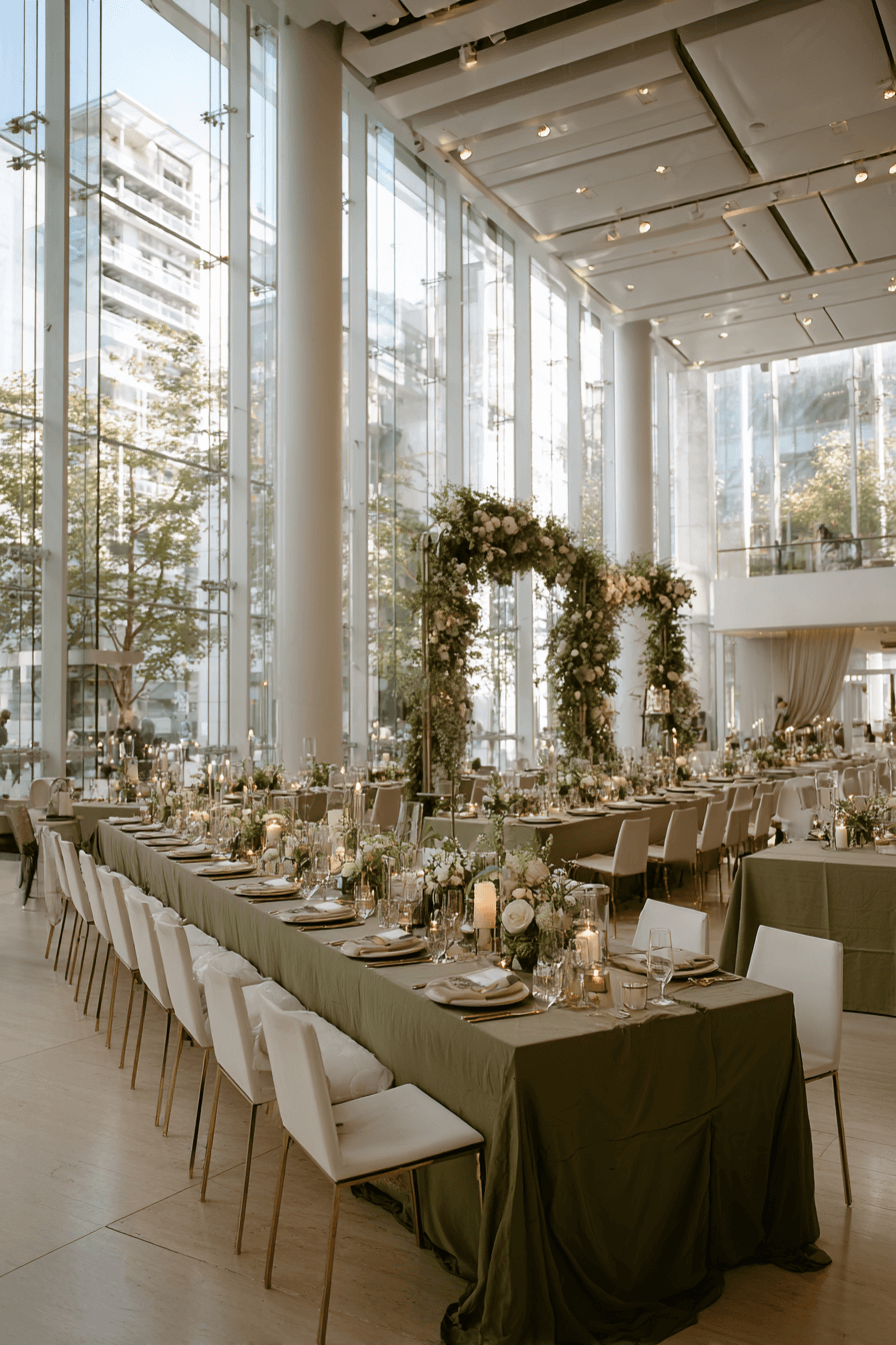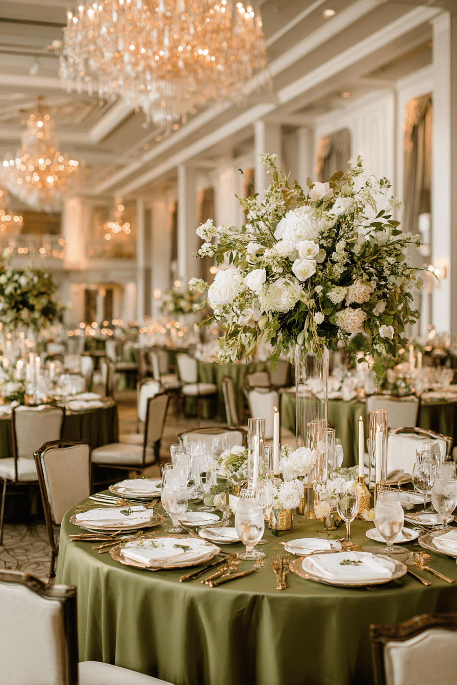 Grand ballrooms feel refreshed with olive green weddings layered into ornate spaces. Olive balances chandeliers and sweeping drapery beautifully. Cream florals soften the richness. The hue keeps the setting from feeling overly traditional. The result feels timeless yet updated. Transform your ballroom vision with olive accents today.