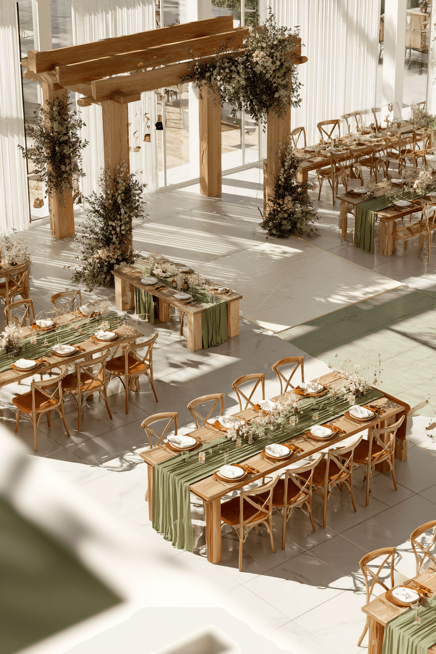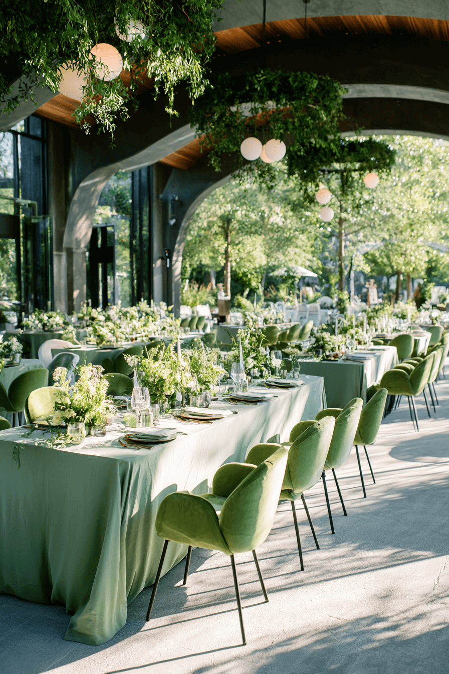 Structured decor layered with botanical accents gives olive green weddings a fresh garden party feel. Olive ties florals and greenery together seamlessly. Sleek chairs and linens add polish. The palette bridges playful and sophisticated effortlessly. The mood feels vibrant and intentional. Host your own contemporary olive celebration today.