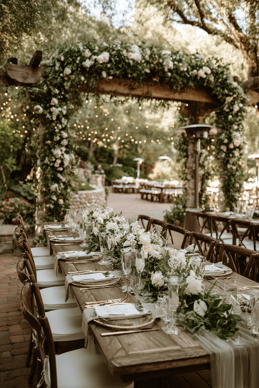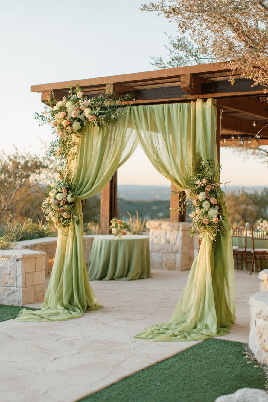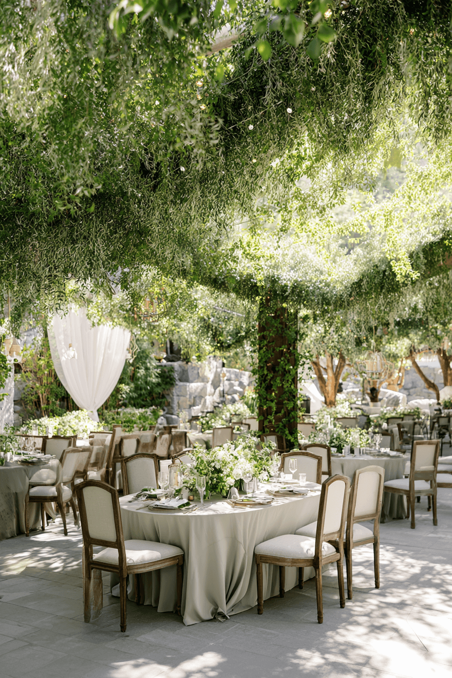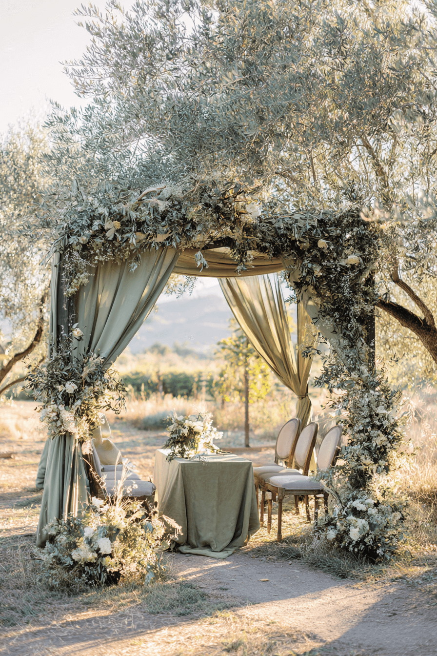 Soft olive undertones add grounding depth to whimsical wedding styling. Olive green weddings pair beautifully with pastels and flowing fabrics. The color keeps romantic details refined. Twinkle lights and greenery enhance the magical mood. The result feels enchanting yet cohesive. Step into your olive fairytale today.