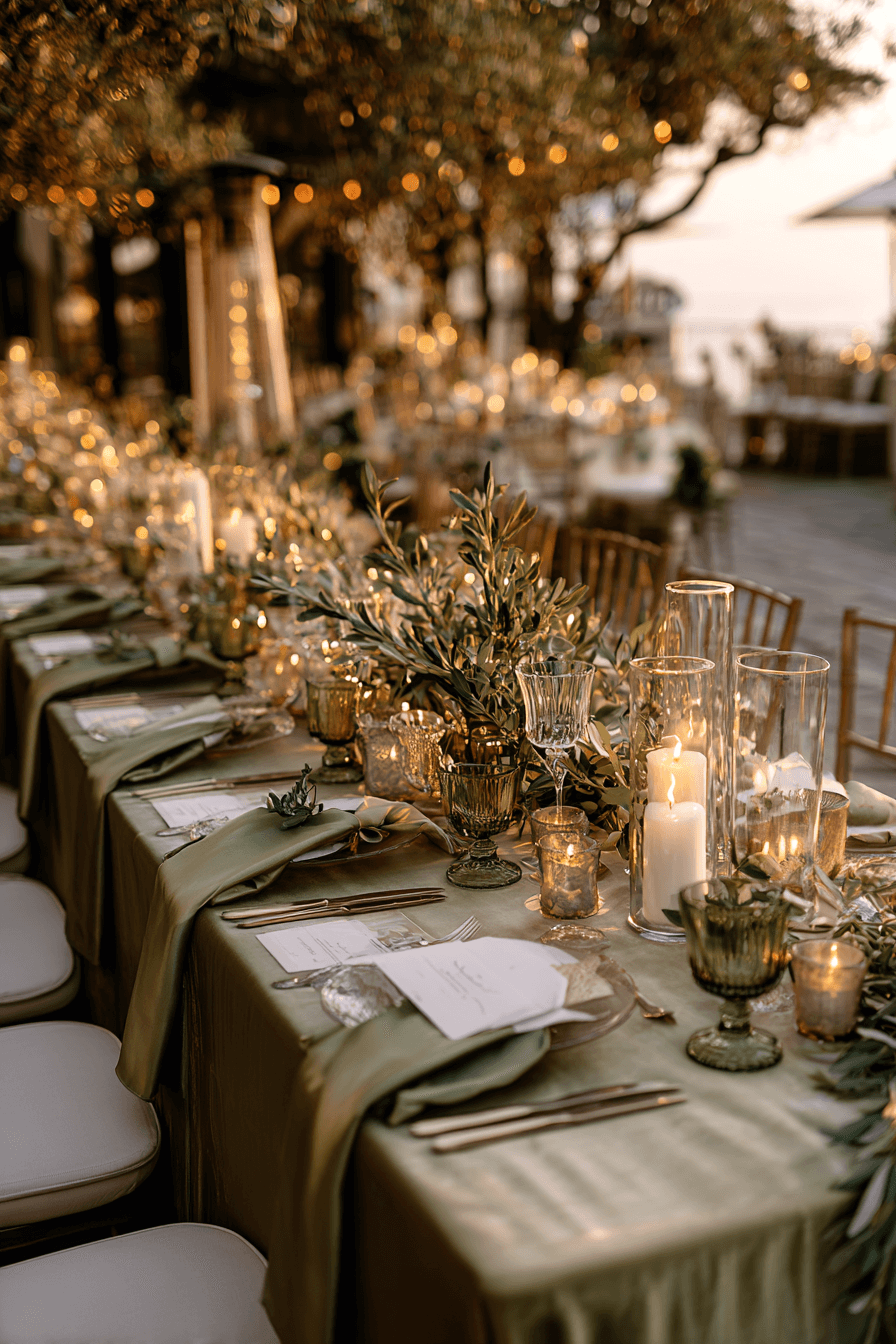 Sunset light enhances the richness of olive green weddings beautifully. The glow amplifies the warmth of green accents. Champagne details and candles deepen the golden ambiance. The setting feels romantic and radiant. Olive reflects soft light effortlessly. Celebrate your love in golden-hour olive style today.
