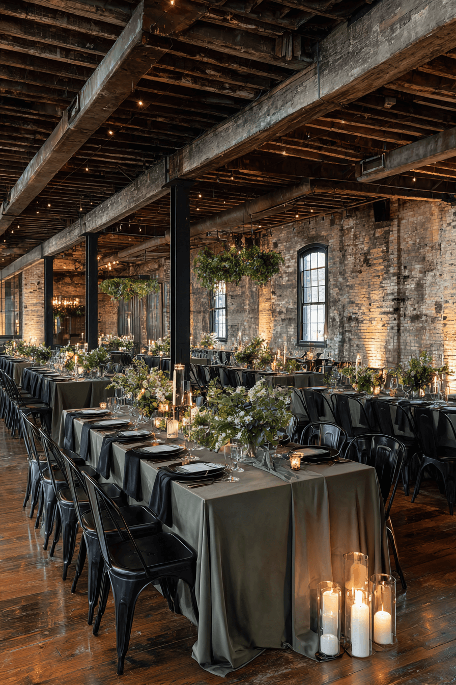 Concrete walls and metal fixtures soften beautifully in olive green weddings. The earthy tone balances raw materials effortlessly. Candlelight and greenery add romantic depth. Olive introduces warmth to industrial settings. The contrast feels stylish and inviting. Explore industrial olive charm for your celebration.