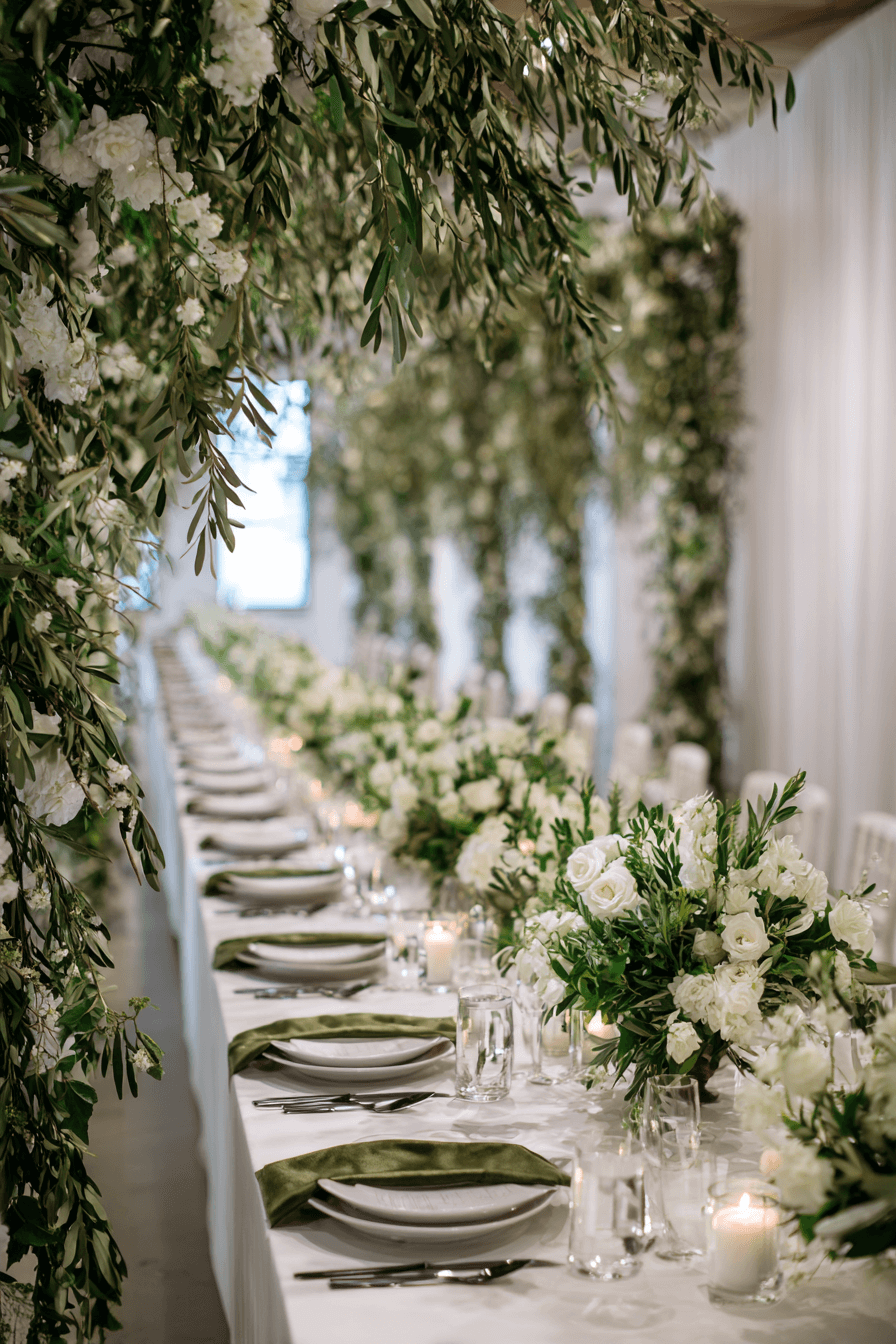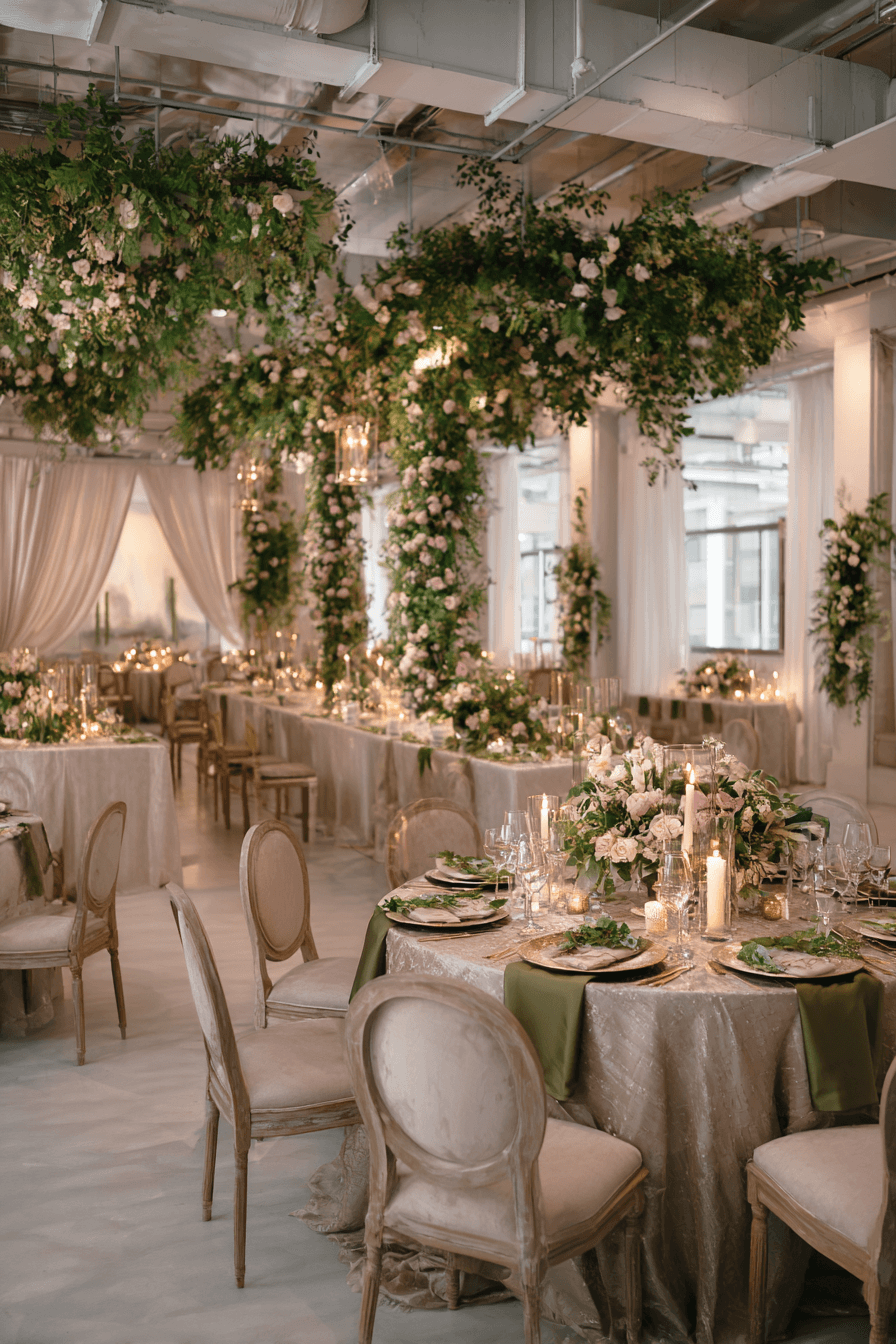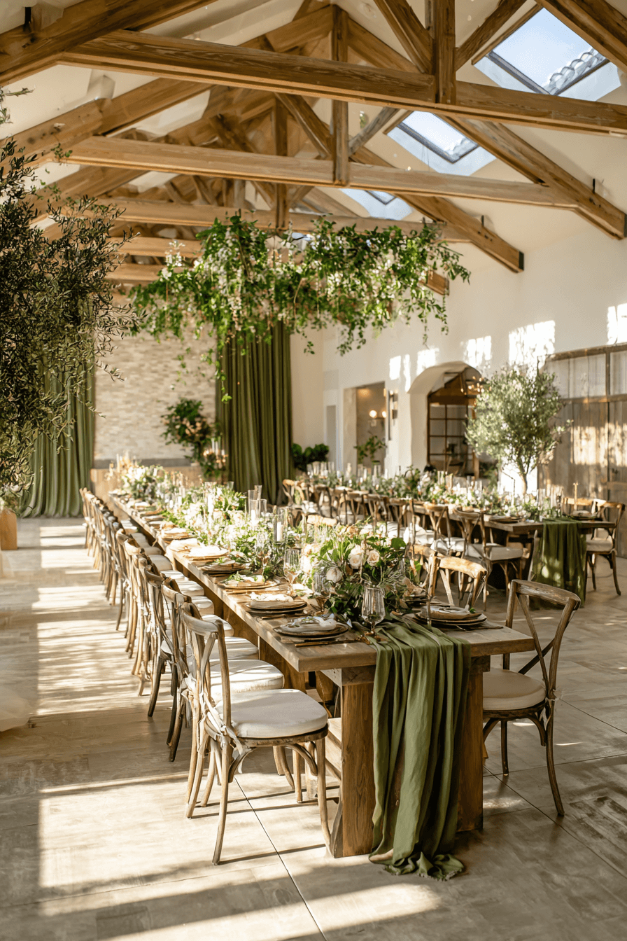 Layered greenery makes olive green weddings feel immersive and vibrant. Olive ties together florals and foliage seamlessly. Warm lighting deepens the enchanting atmosphere. The palette feels cohesive and fresh. The celebration feels lush yet polished. Design your own olive soirée now.
