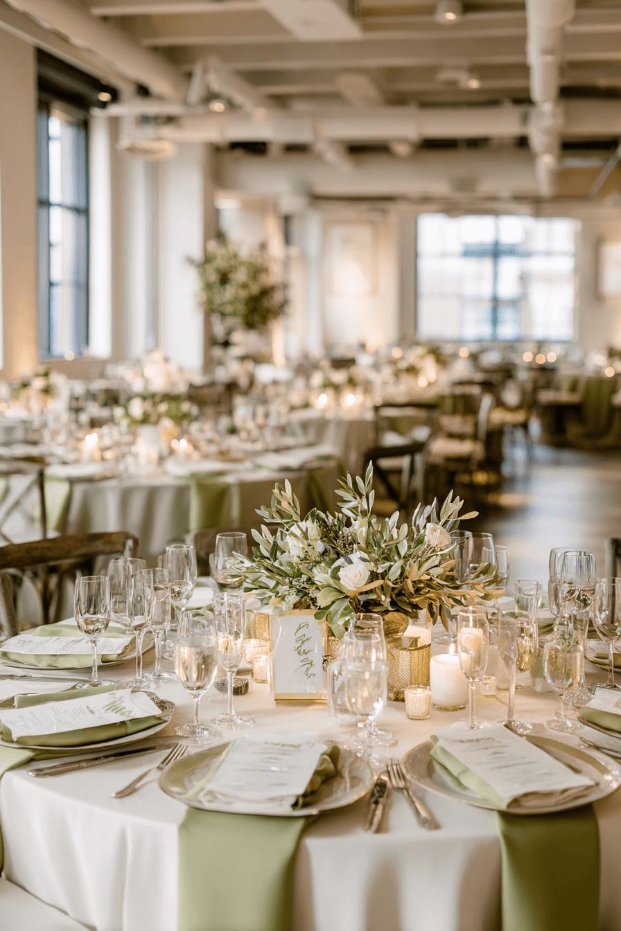 Formal settings feel elevated with olive green weddings woven into the decor. Olive adds richness to traditional black-and-white palettes. Tall arrangements and crystal glassware amplify the grandeur. The green softens formality just enough. The overall effect feels dramatic and refined. Elevate your black-tie affair with olive sophistication.
