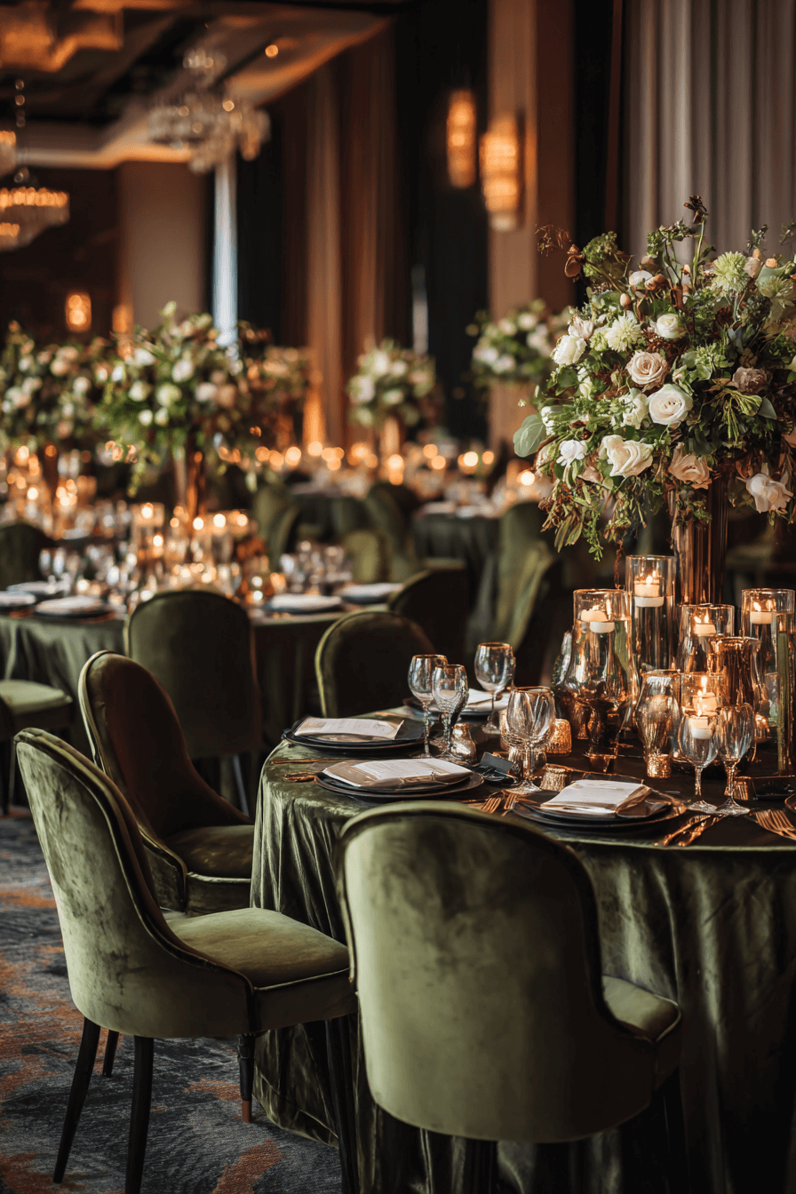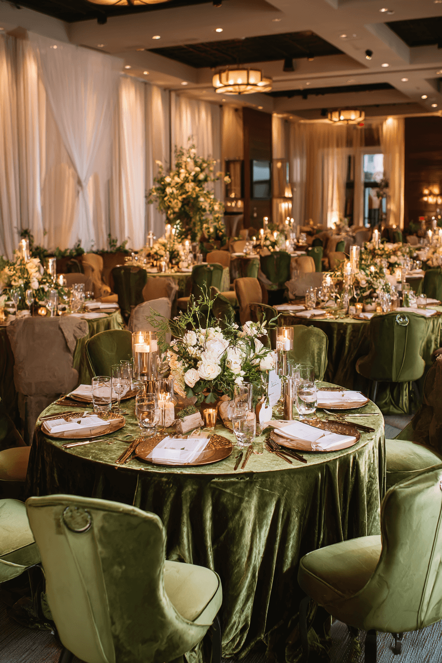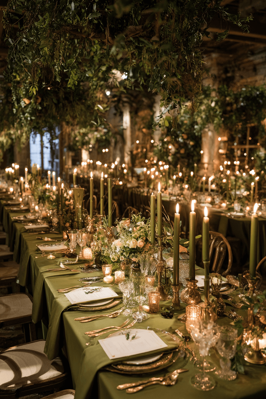 Darker olive hues create an intimate, moody atmosphere for olive green weddings. Velvet linens and tall candles enhance the richness beautifully. The deeper tone adds sophistication without feeling heavy. Lighter accents pop against the bold backdrop. The overall mood feels luxe and romantic. Create your own dramatic olive celebration now.