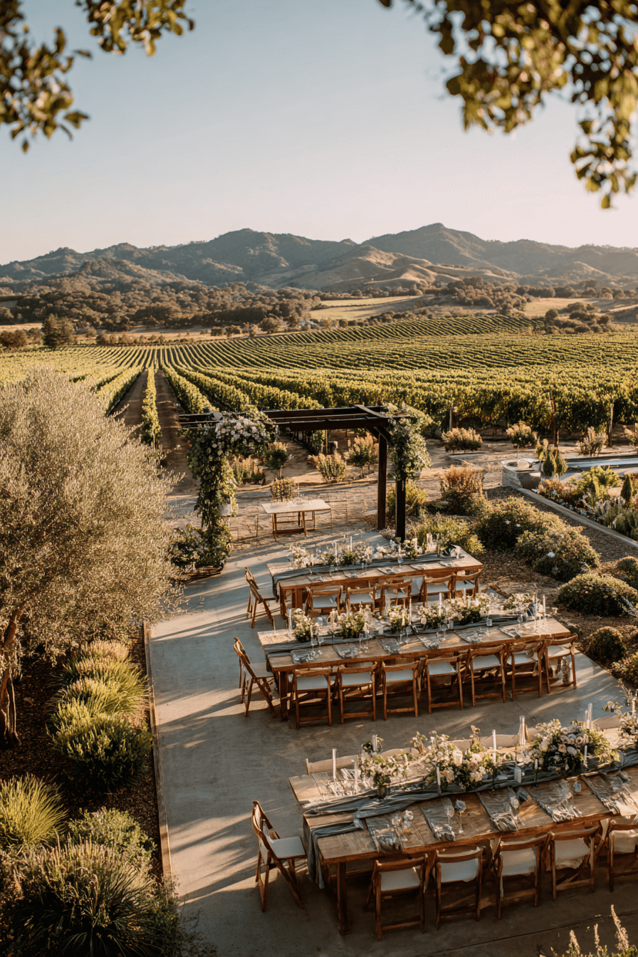 Rolling hills and rustic charm pair perfectly with olive green weddings. Olive complements wooden tables, wine barrels, and candlelit receptions beautifully. The palette mirrors the landscape for a seamless experience. Cream florals soften the richness just enough. The atmosphere feels romantic and timeless. Toast to vineyard-inspired olive elegance now.