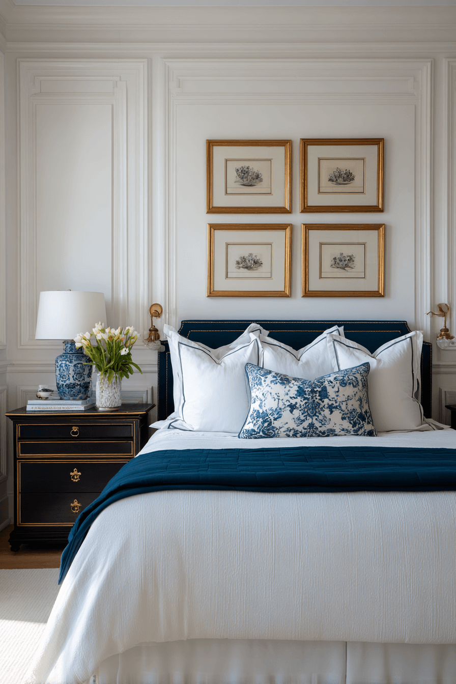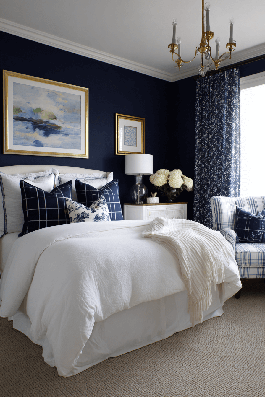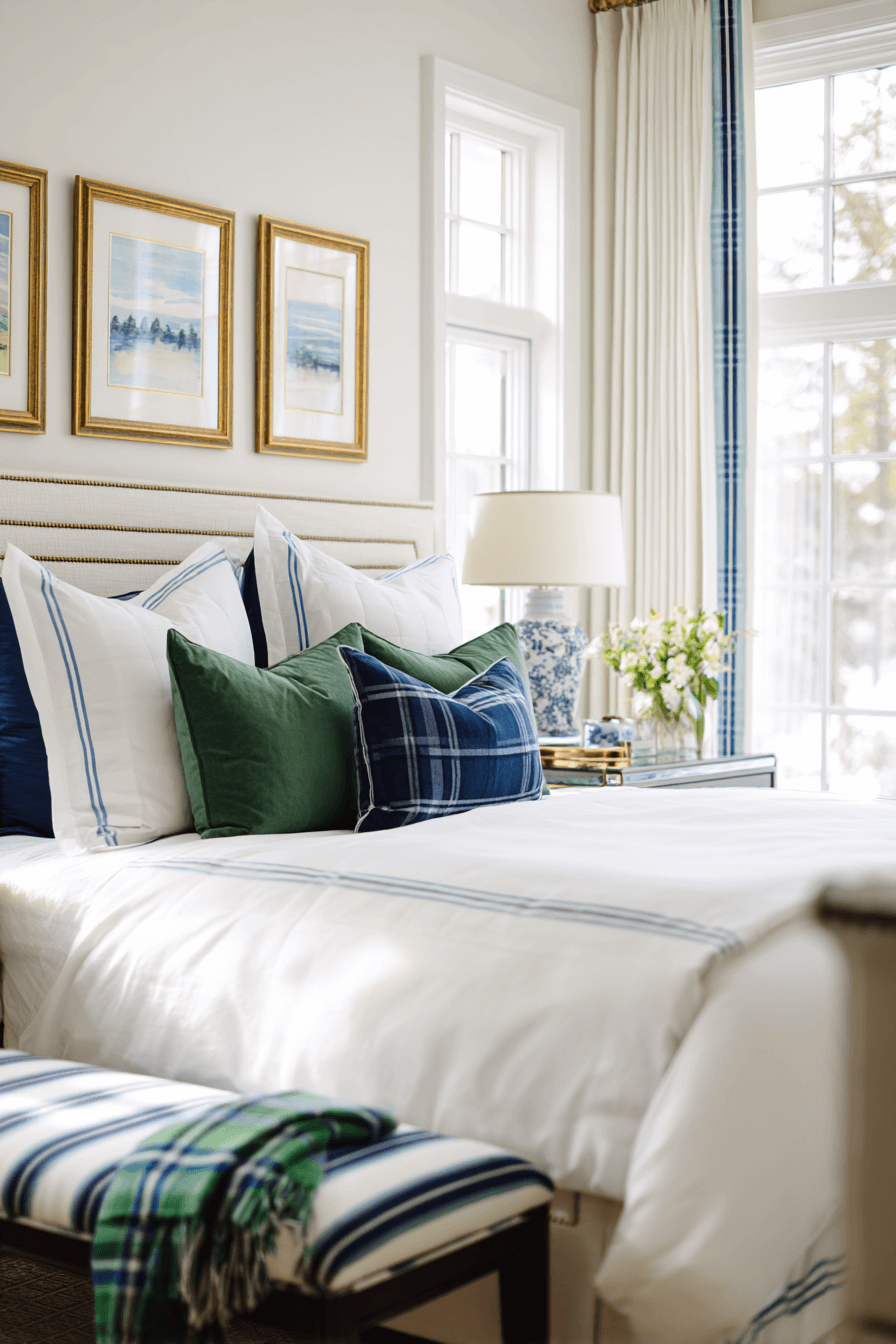 A crisp navy and white palette creates a striking foundation for a timeless preppy bedroom. The contrast feels sharp, clean, and endlessly sophisticated. Layered patterns like plaid or subtle stripes add dimension without disrupting balance. Polished hardware and framed art complete the refined aesthetic. The simplicity of this pairing keeps the preppy bedroom feeling classic yet fresh. Discover how this iconic color duo can anchor your entire design.