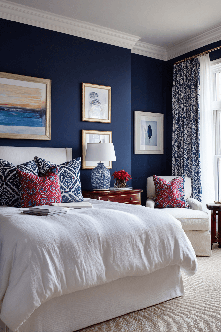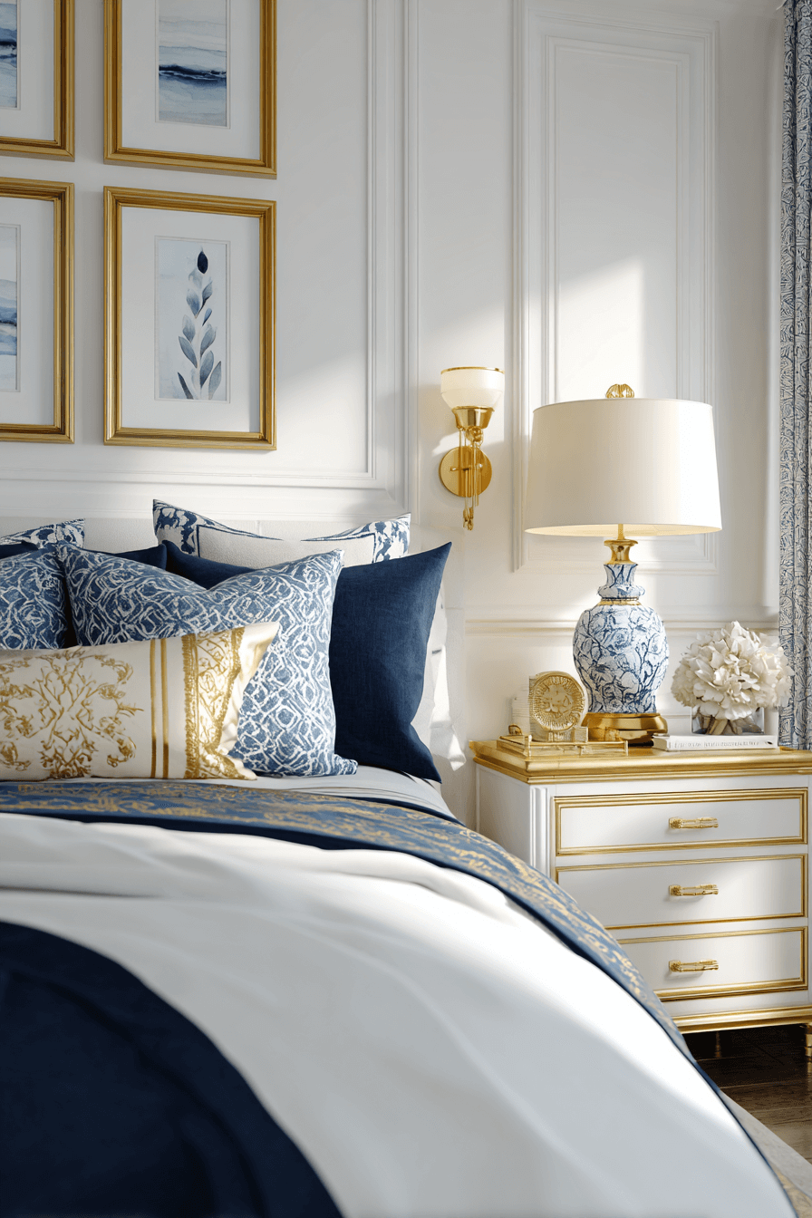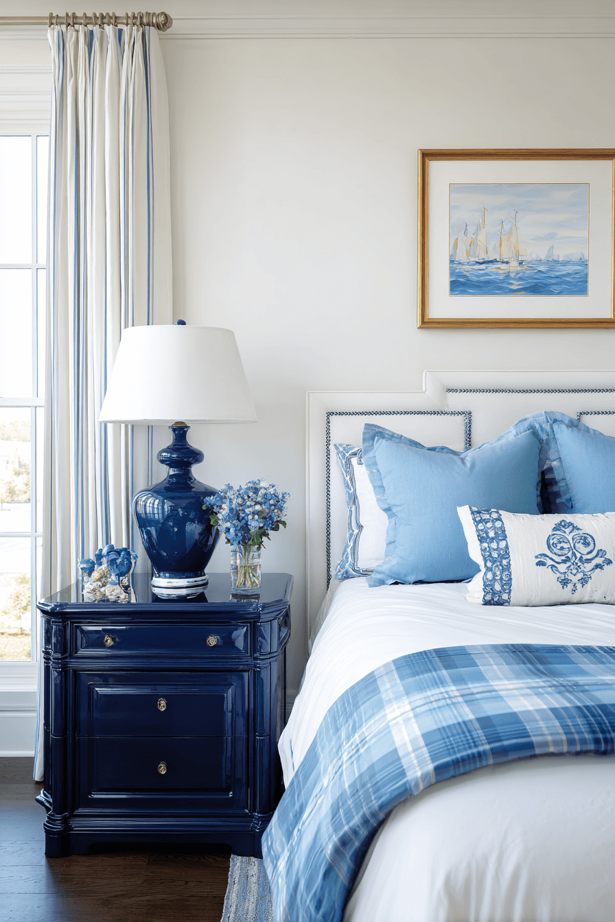 A crisp navy and white palette creates a striking foundation for a timeless preppy bedroom. The contrast feels sharp, clean, and endlessly sophisticated. Layered patterns like plaid or subtle stripes add dimension without disrupting balance. Polished hardware and framed art complete the refined aesthetic. The simplicity of this pairing keeps the preppy bedroom feeling classic yet fresh. Discover how this iconic color duo can anchor your entire design.