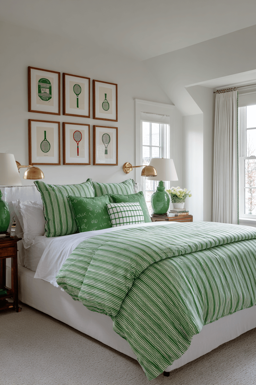 Sporty elegance adds character and heritage to a refined preppy bedroom. Subtle nods like framed racquet art or green-and-white accents introduce classic club charm. Tailored bedding and structured décor maintain sophistication. Keeping the palette cohesive prevents the theme from feeling overwhelming. The overall vibe feels curated and timeless in a preppy bedroom. Click to channel country-club inspiration in your space.