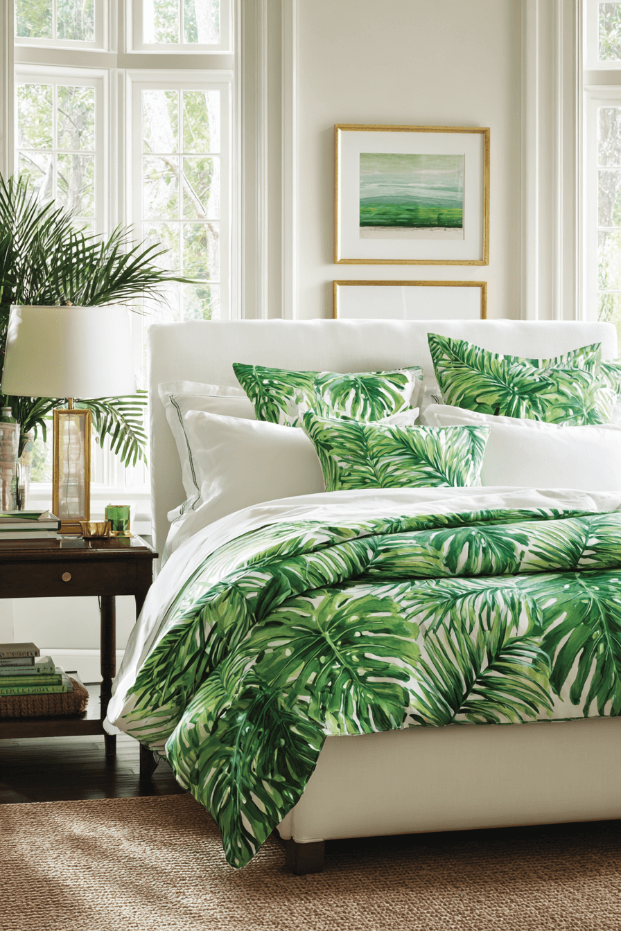 Lush palm patterns can feel elevated when styled thoughtfully in a preppy bedroom. Classic greens paired with crisp whites keep the look polished instead of tropical. Tailored furniture and clean lines provide structure against the bold print. Organized décor ensures everything feels intentional. The balance of energy and refinement defines this vibrant preppy bedroom. Explore how to mix tropical flair with tailored style today.