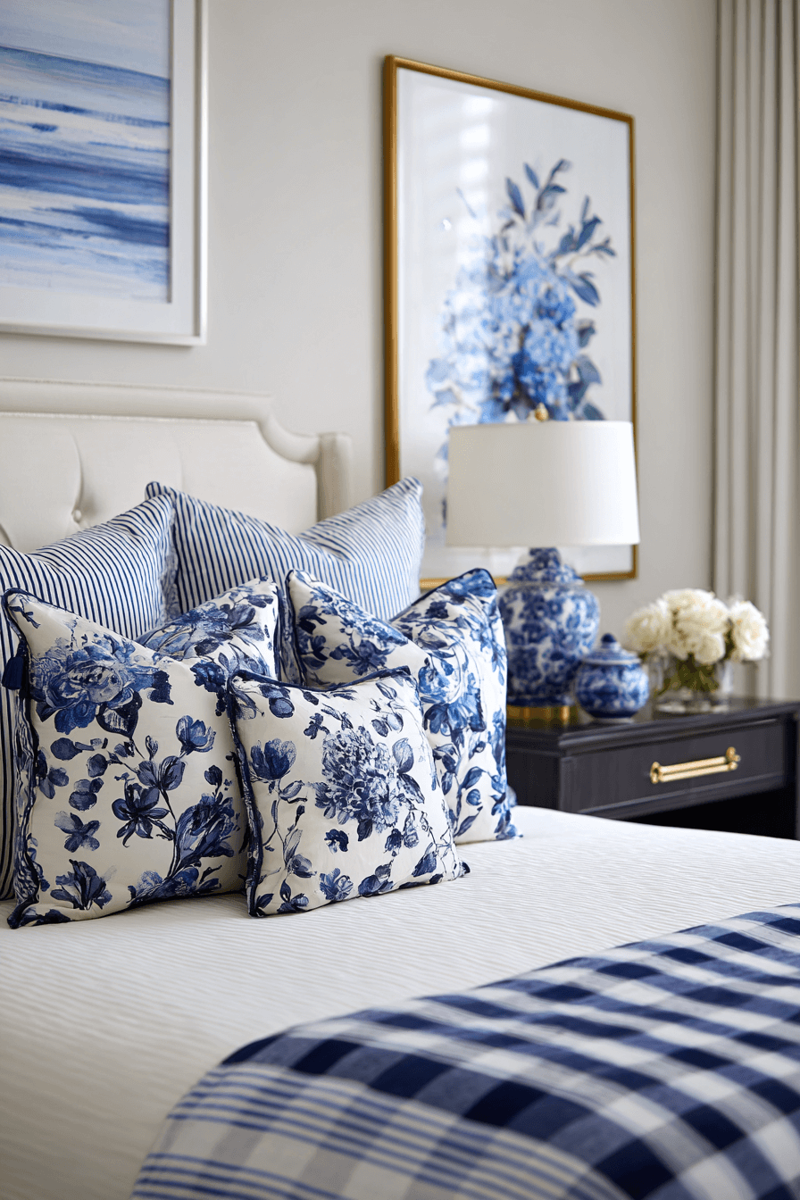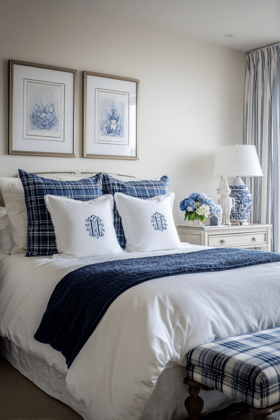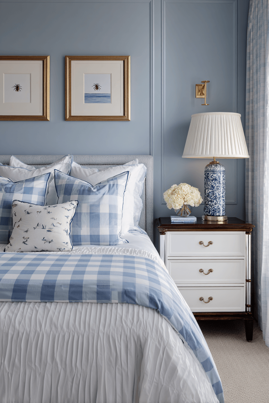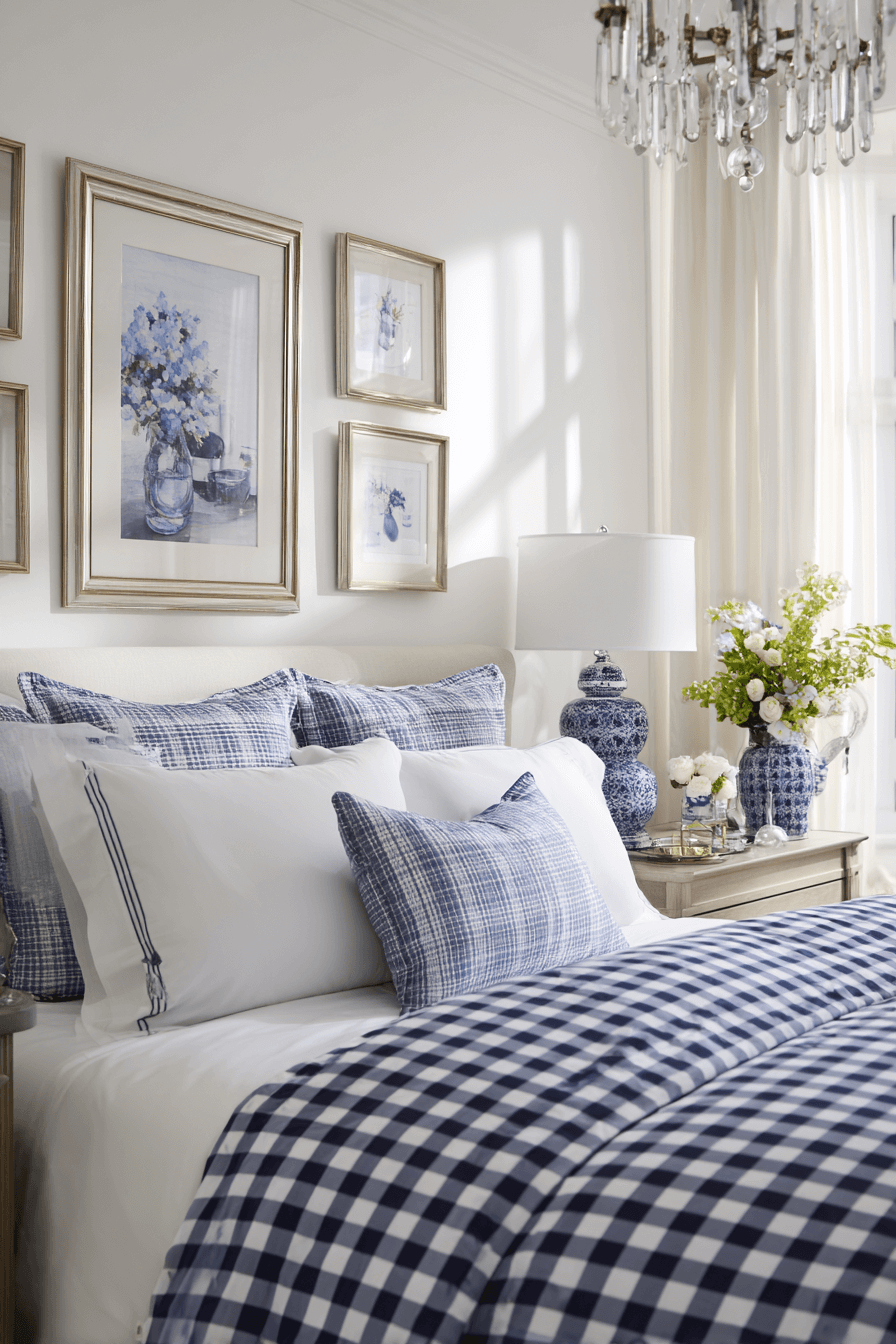 Charming gingham offers a lighthearted yet structured detail within a thoughtfully designed preppy bedroom. The small-scale pattern keeps the space airy while adding visual interest. Crisp white linens and subtle navy accents provide beautiful contrast. Framed art and tidy surfaces complete the polished presentation. Everything feels balanced and intentional in this preppy bedroom. Discover how gingham can add cheerful refinement to your retreat.