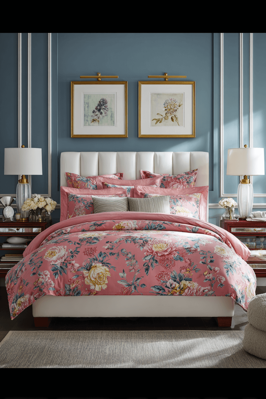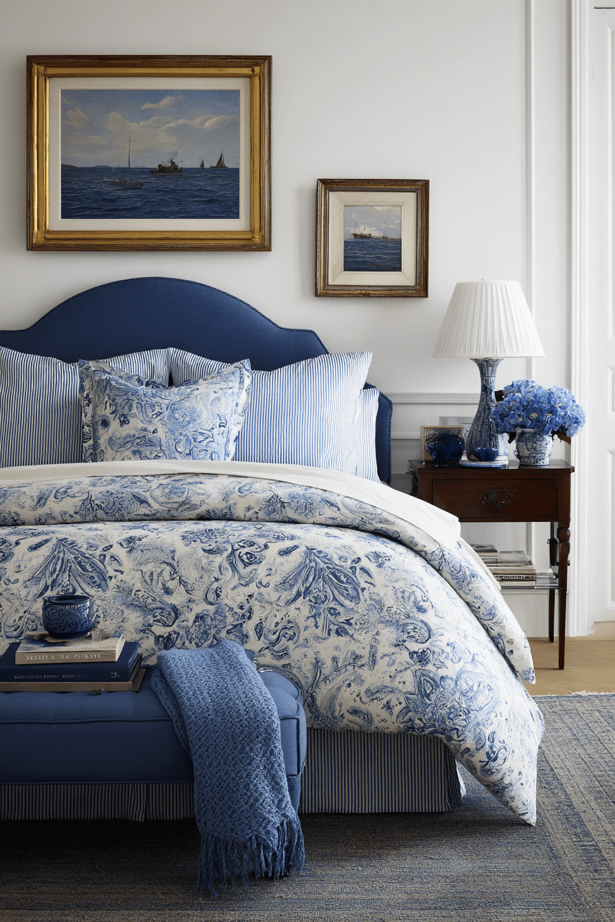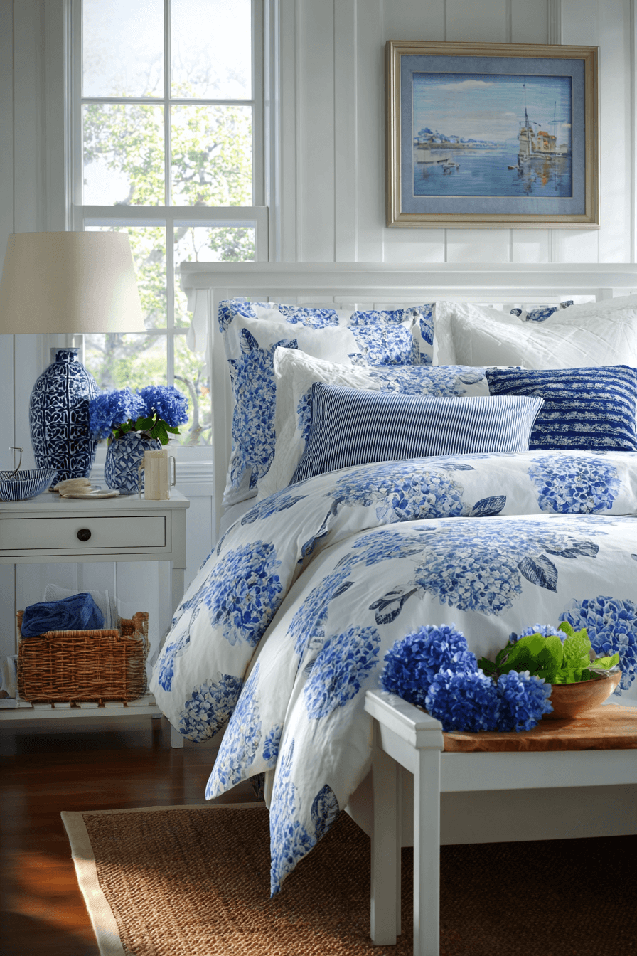 Soft blue hydrangea motifs bring timeless garden elegance into a serene preppy bedroom. Paired with white furniture and polished accents, the florals feel fresh and classic. Symmetry keeps the design tailored and structured. Light layering enhances the refined atmosphere. Every detail supports the charm of a balanced preppy bedroom. Tap to embrace floral sophistication in your space.