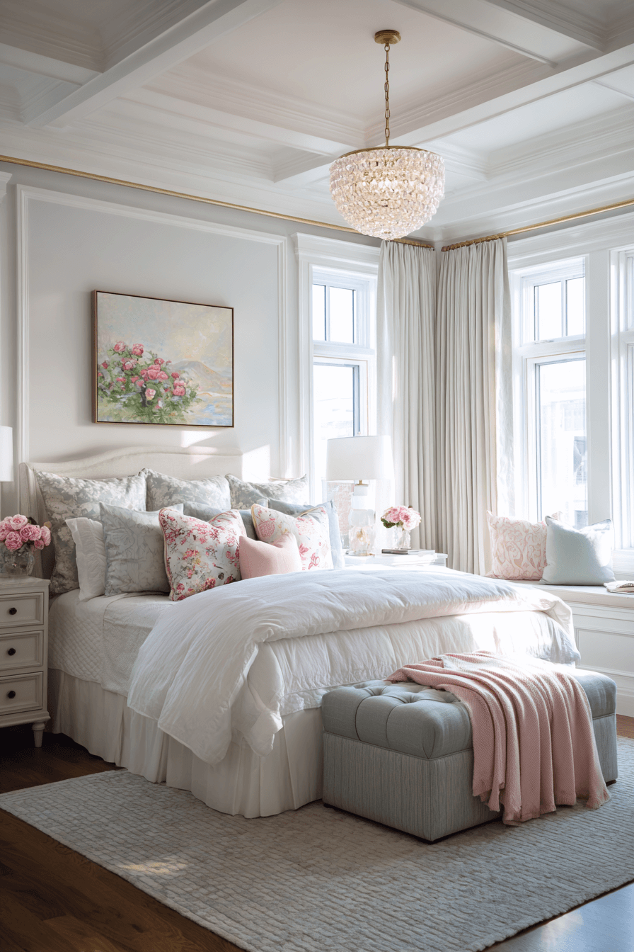 Delicate pastels layered thoughtfully create a light and uplifting preppy bedroom. Pale pinks, mint greens, and baby blues glow beautifully against crisp white. Tailored bedding and subtle patterns maintain structure. Polished lighting enhances the refined aesthetic. The room feels cheerful yet composed as a preppy bedroom. Click to brighten your design with soft, joyful color.