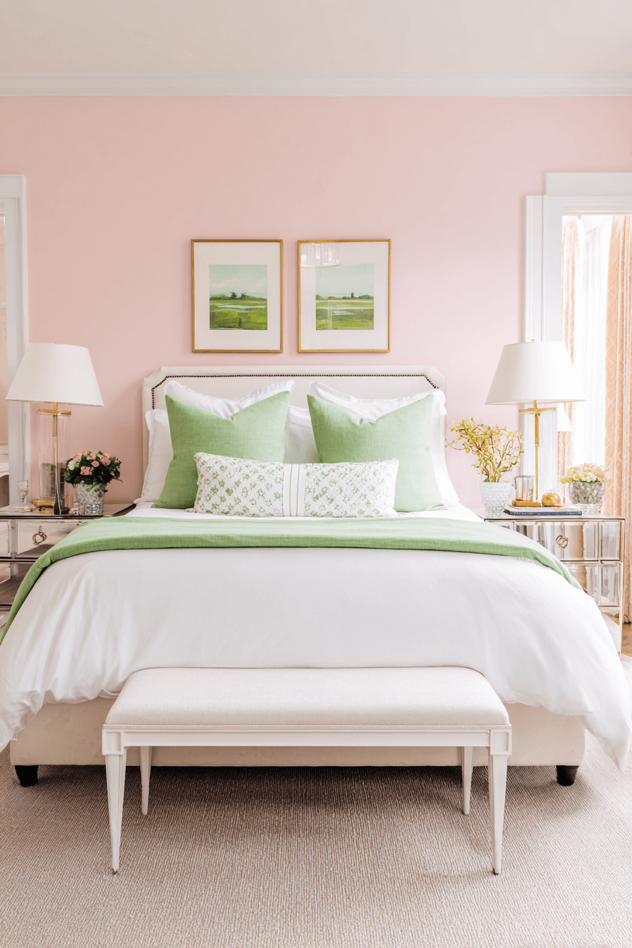 Pink paired with green brings vibrant personality into a playful yet refined preppy bedroom. Soft blush tones alongside rich emerald accents create dynamic contrast that still feels polished. Patterned bedding or bold accessories tie the palette together seamlessly. Crisp white trim and metallic details elevate the look with structure. The combination feels cheerful while maintaining sophistication in a preppy bedroom. Tap to introduce this iconic color story into your own space.