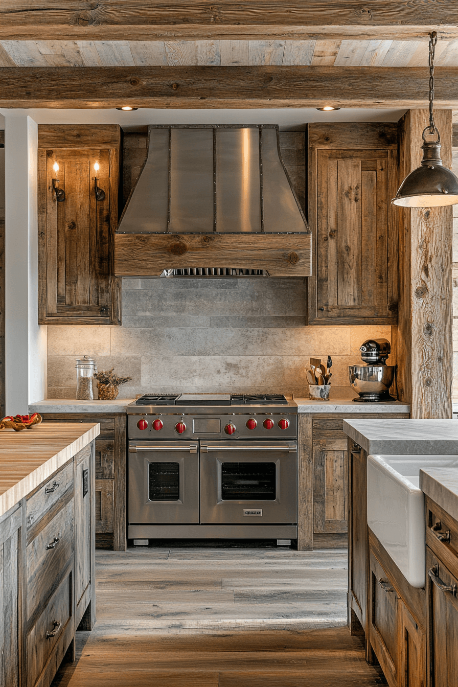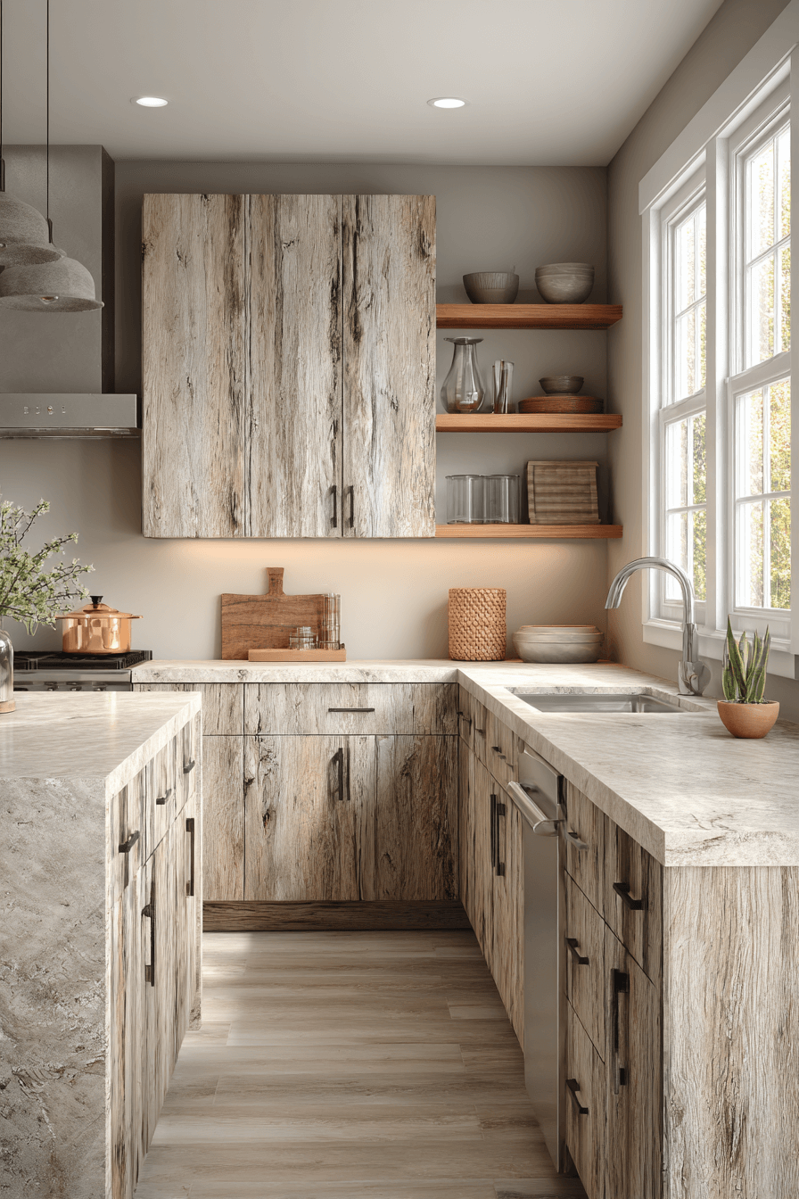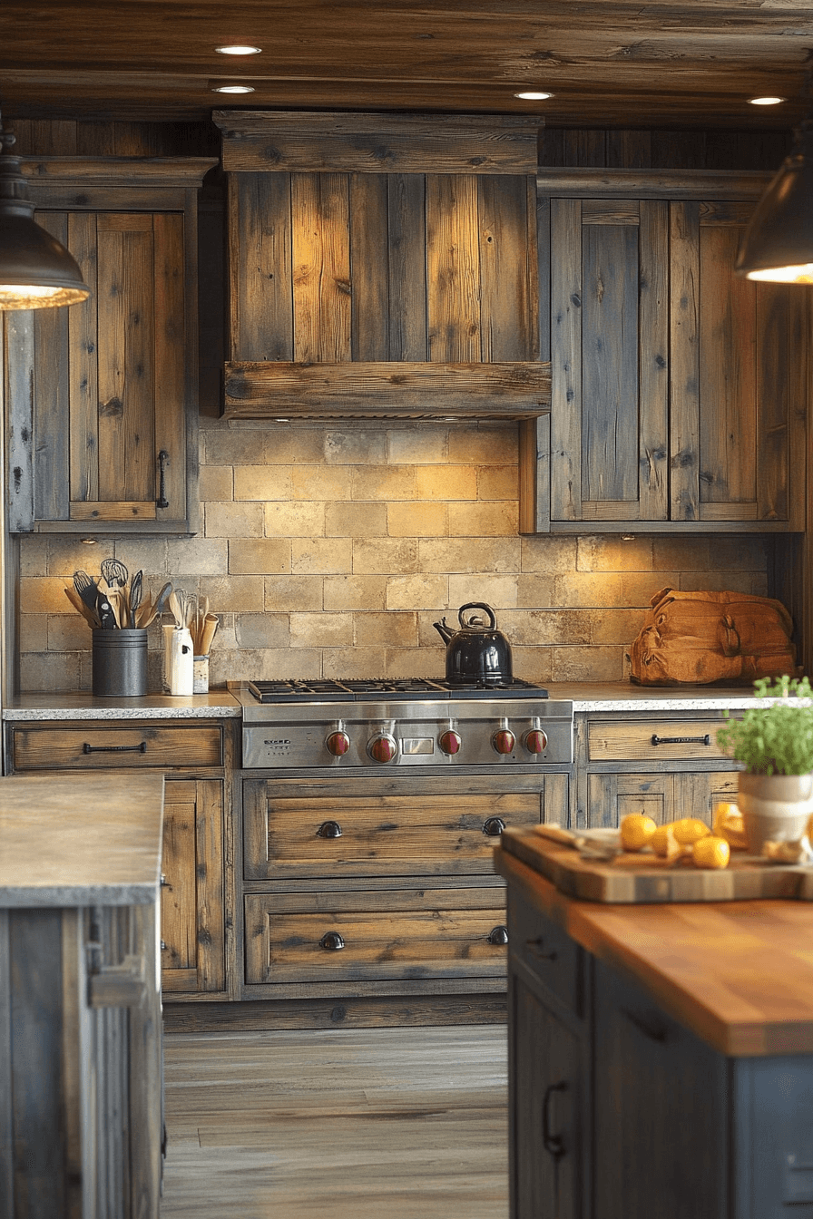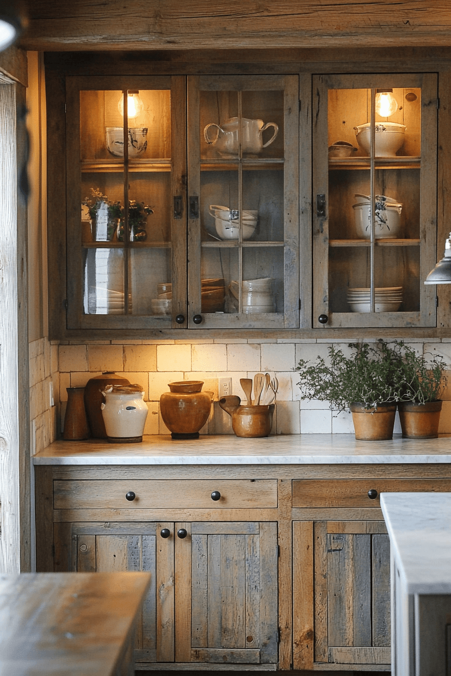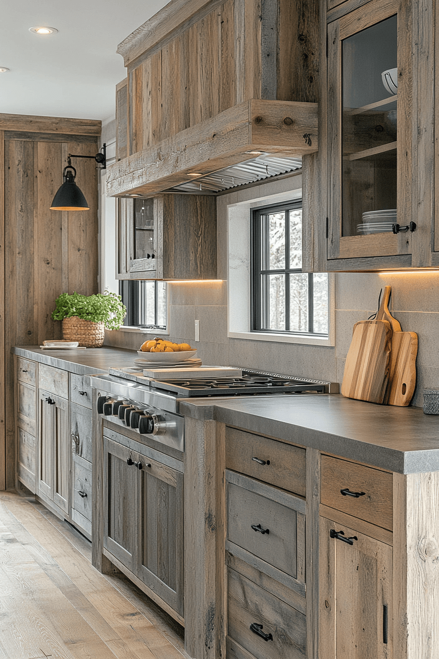 - Furniture: reclaimed barnwood base cabinets with visible grain and patina, paired with simple shaker-style uppers in matching weathered finish
