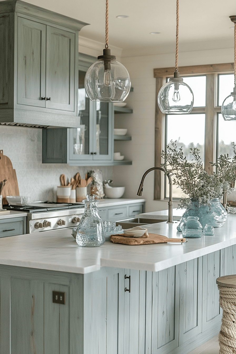 There’s something instantly calming about this palette—it feels like the kitchen has already lived through a decade of Sunday mornings and salty breezes.