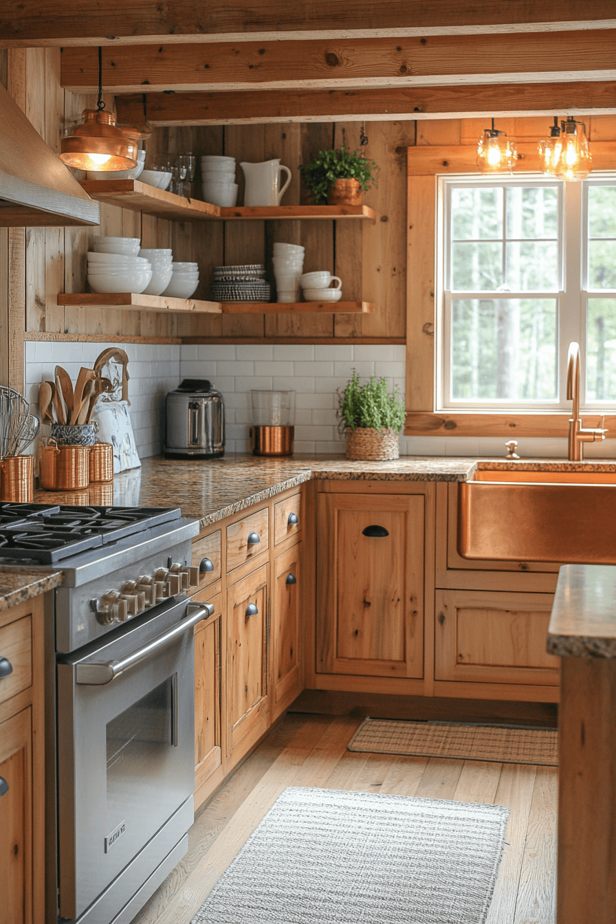 - Materials: knotty pine planks with visible grain, hand-forged iron hardware, rough-hewn stone or slate flooring, copper farmhouse sink