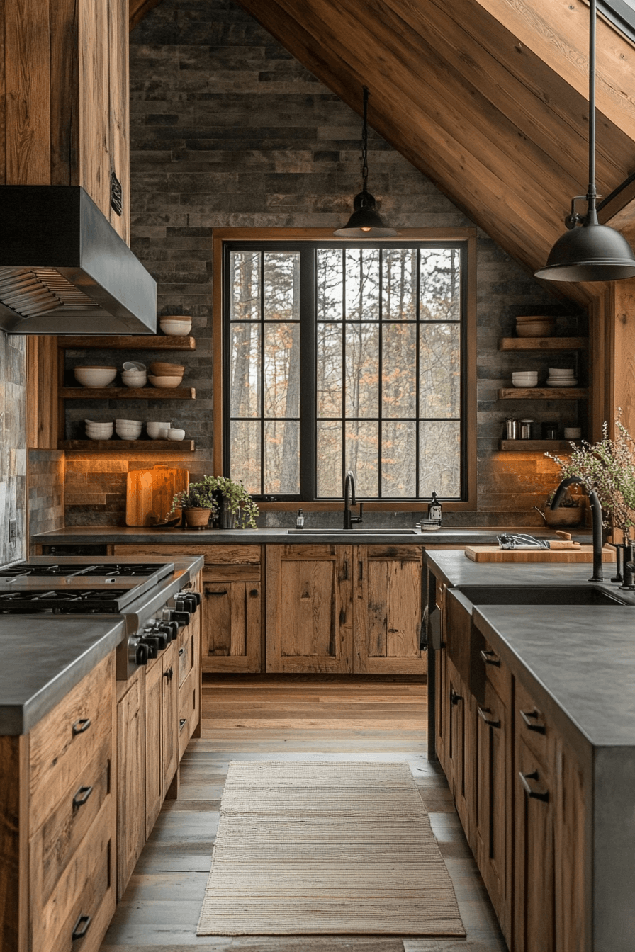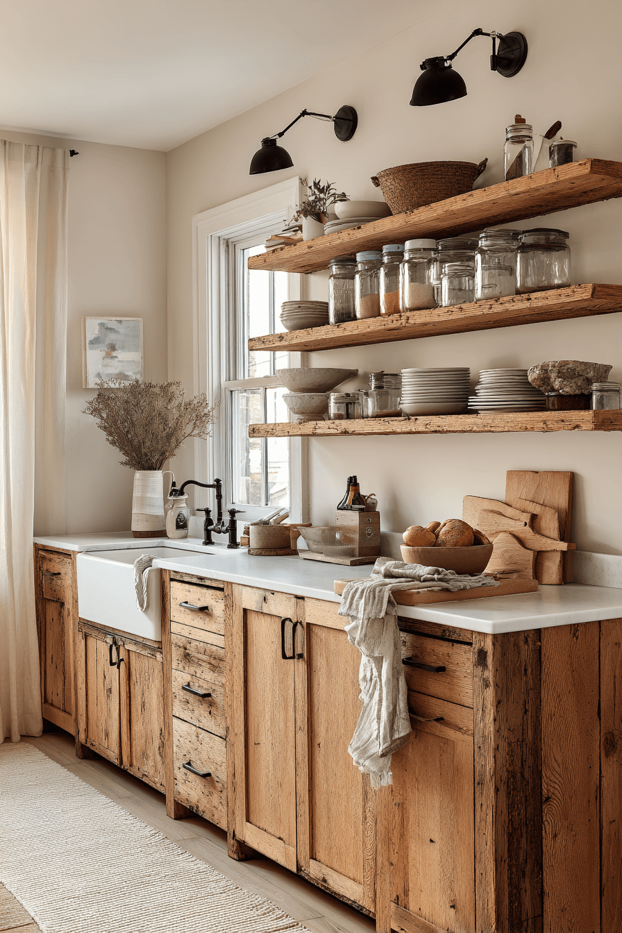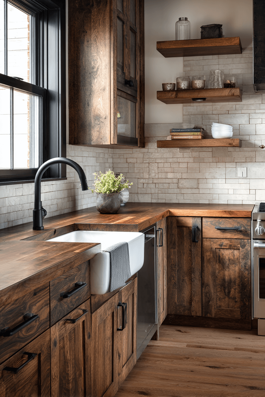 - Furniture: Reclaimed wood kitchen island with live-edge countertop, open shelving with iron brackets, farmhouse sink with matte black faucet