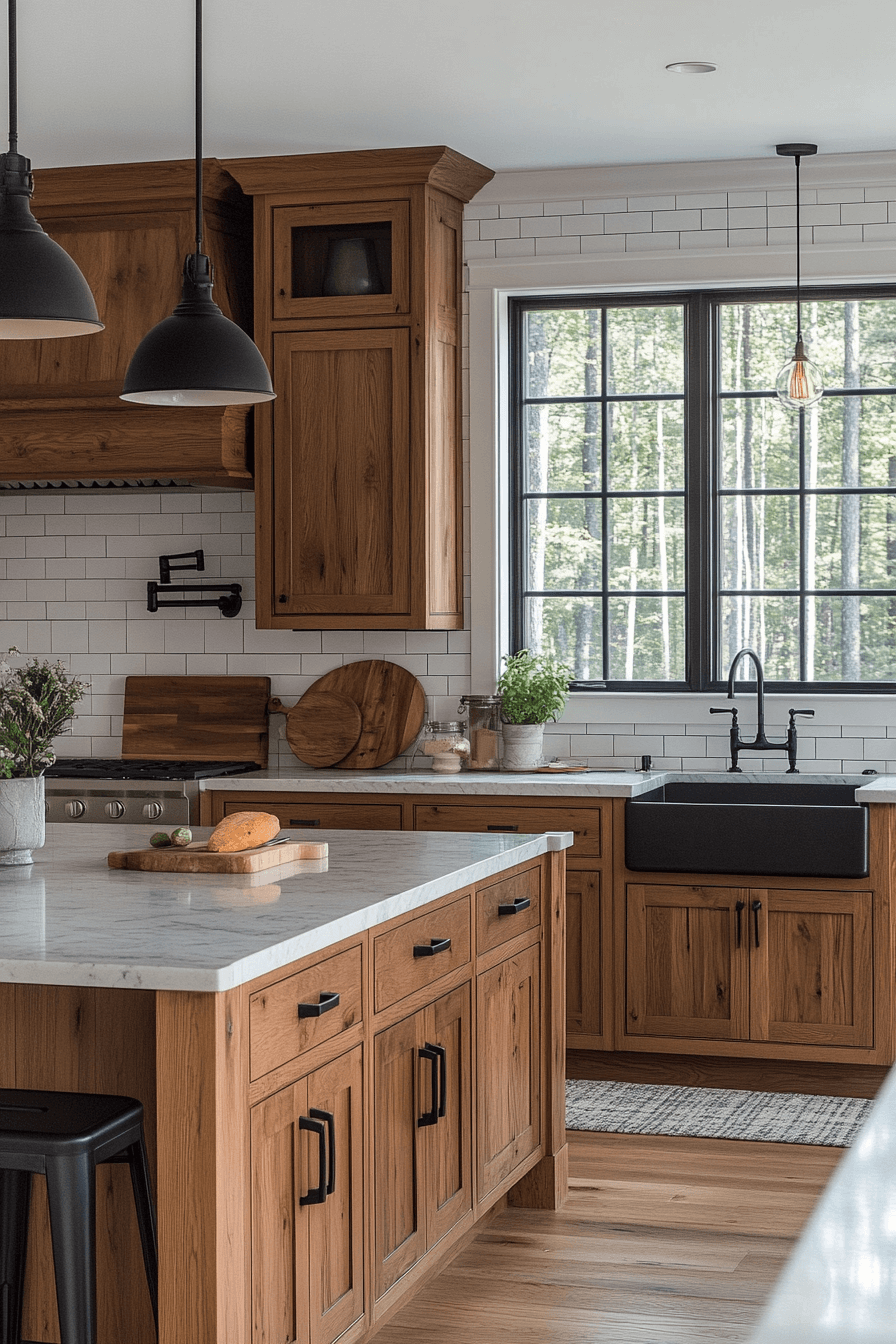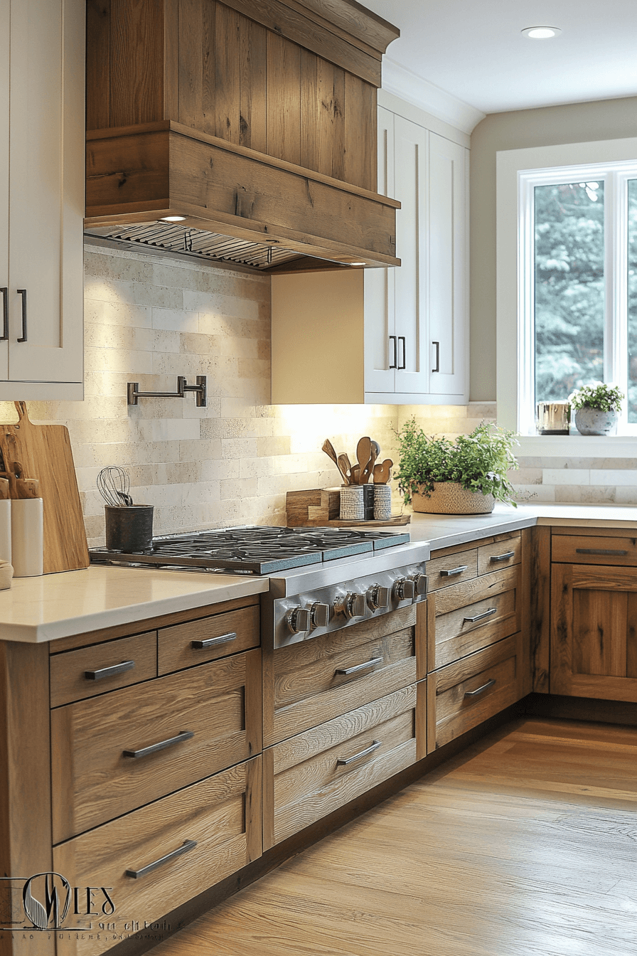 - Materials: reclaimed barn wood, white oak, walnut accents, hand-forged iron hardware, natural stone backsplash