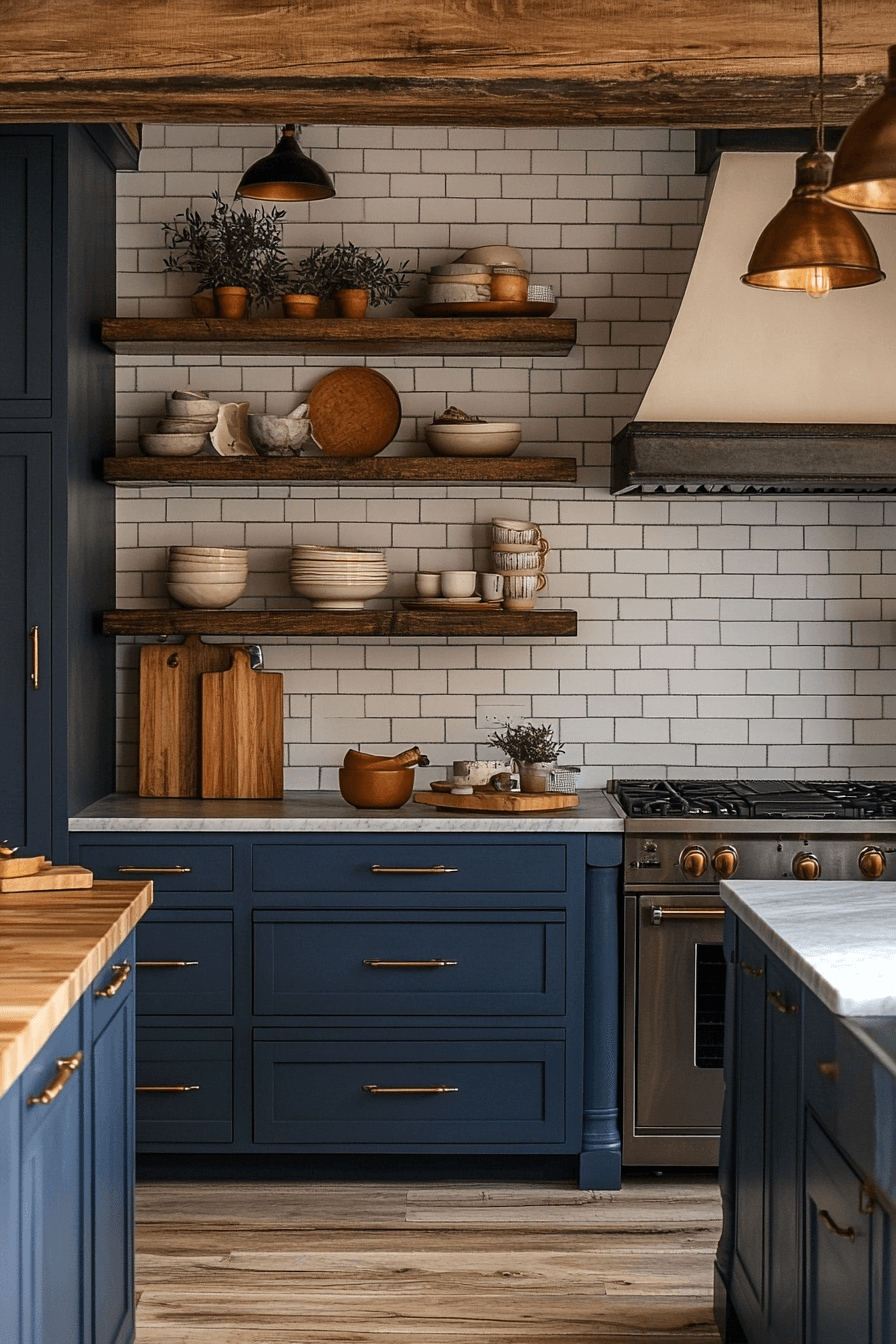 Muted blue tones introduce calm depth into rustic kitchen cabinets while maintaining warmth. Shades like navy, slate, and dusty blue pair beautifully with wood textures and brass accents. The palette feels peaceful yet distinctive. This style works especially well in lakeside or countryside homes. Blue adds color without overwhelming the rustic aesthetic. Discover blue-toned rustic kitchen cabinets with relaxed elegance.