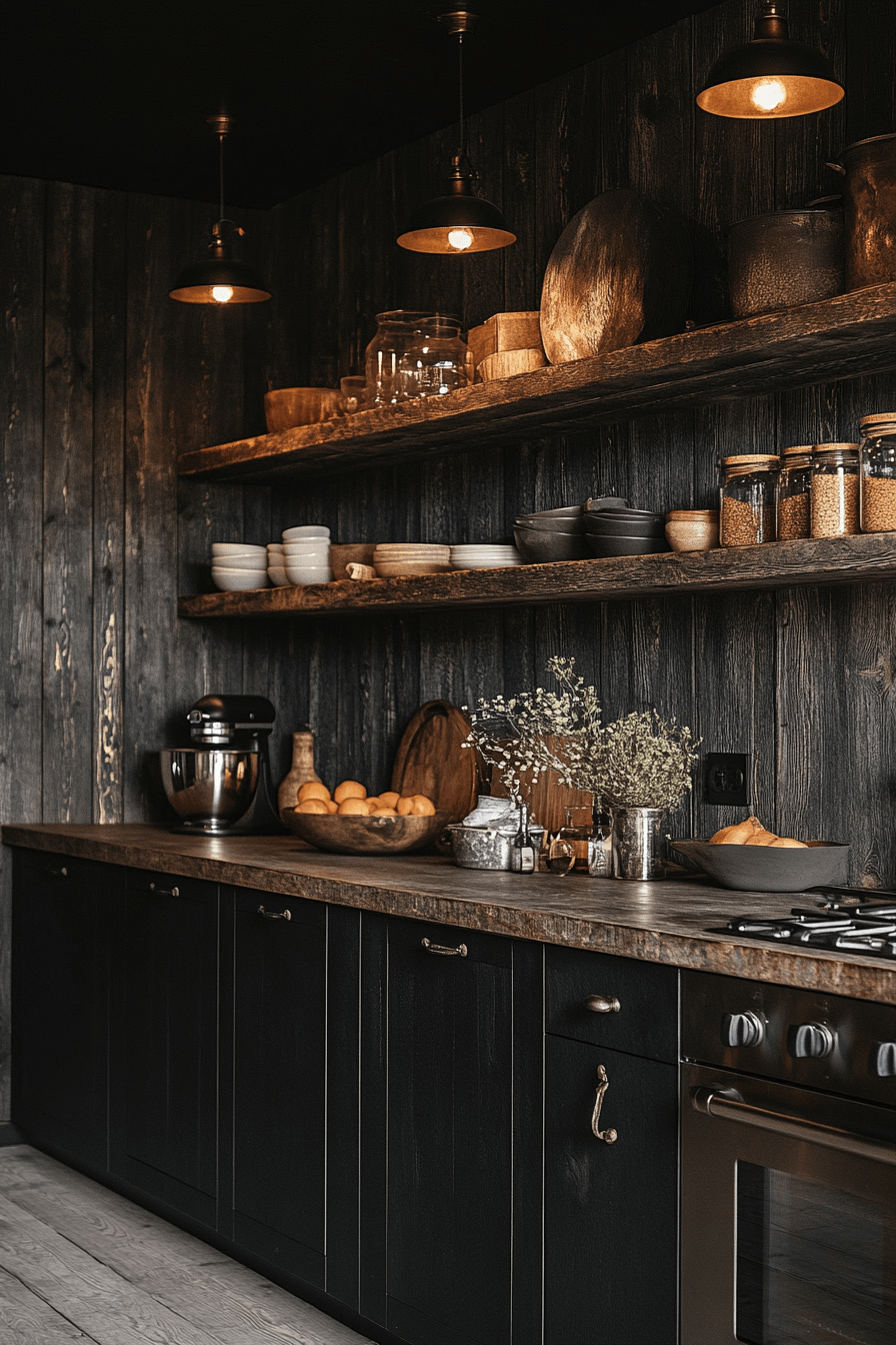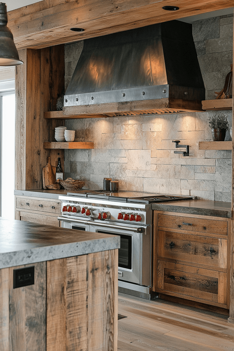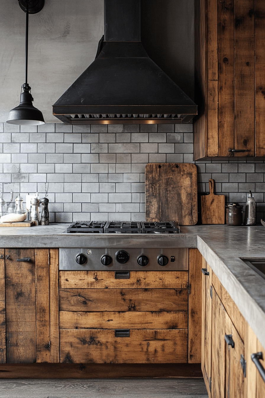- Materials: Raw reclaimed oak cabinet fronts, blackened steel hardware and brackets, concrete or soapstone countertops, exposed brick or blackened steel backsplash, visible wood grain with matte seal