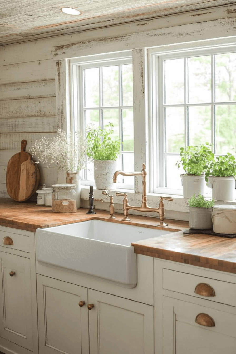 - Materials: Butcher block countertops, beadboard cabinet panels, cast iron apron-front sink, unlacquered brass pulls