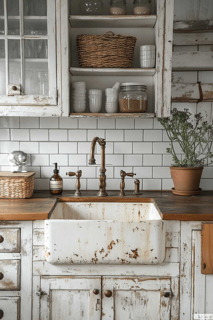 - Materials: distressed white painted wood with visible grain, black wrought iron hardware, reclaimed barn wood accents, honed marble or soapstone countertops, subway tile backsplash