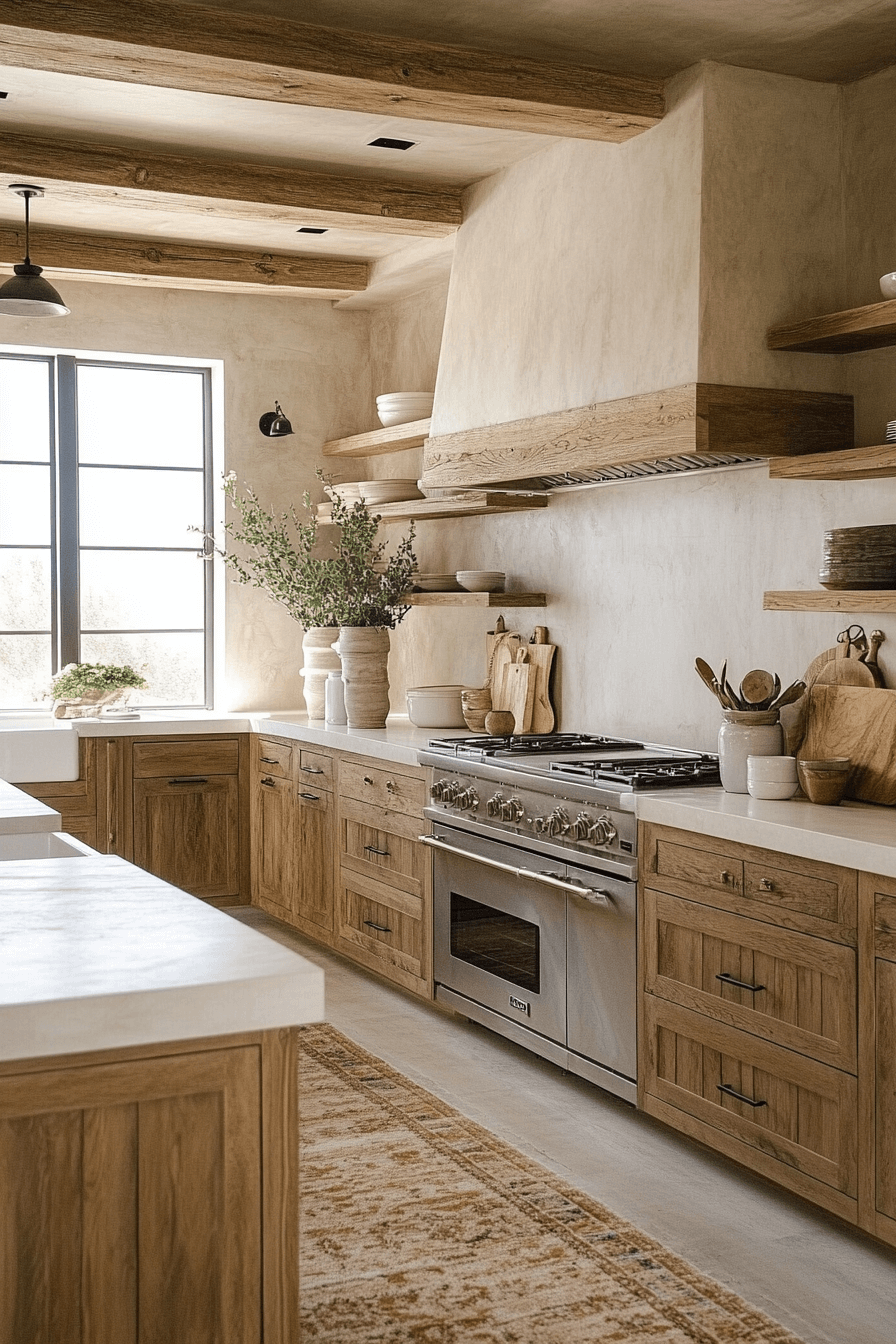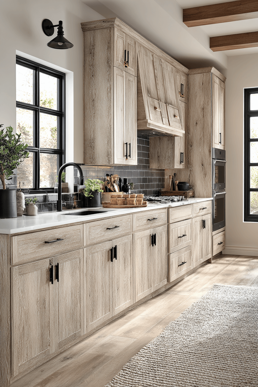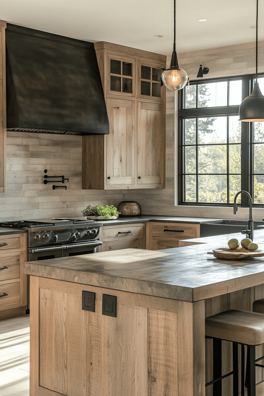 - Materials: unfinished reclaimed oak, blackened steel hardware, hand-forged iron pulls, matte concrete backsplash, natural linen window treatments