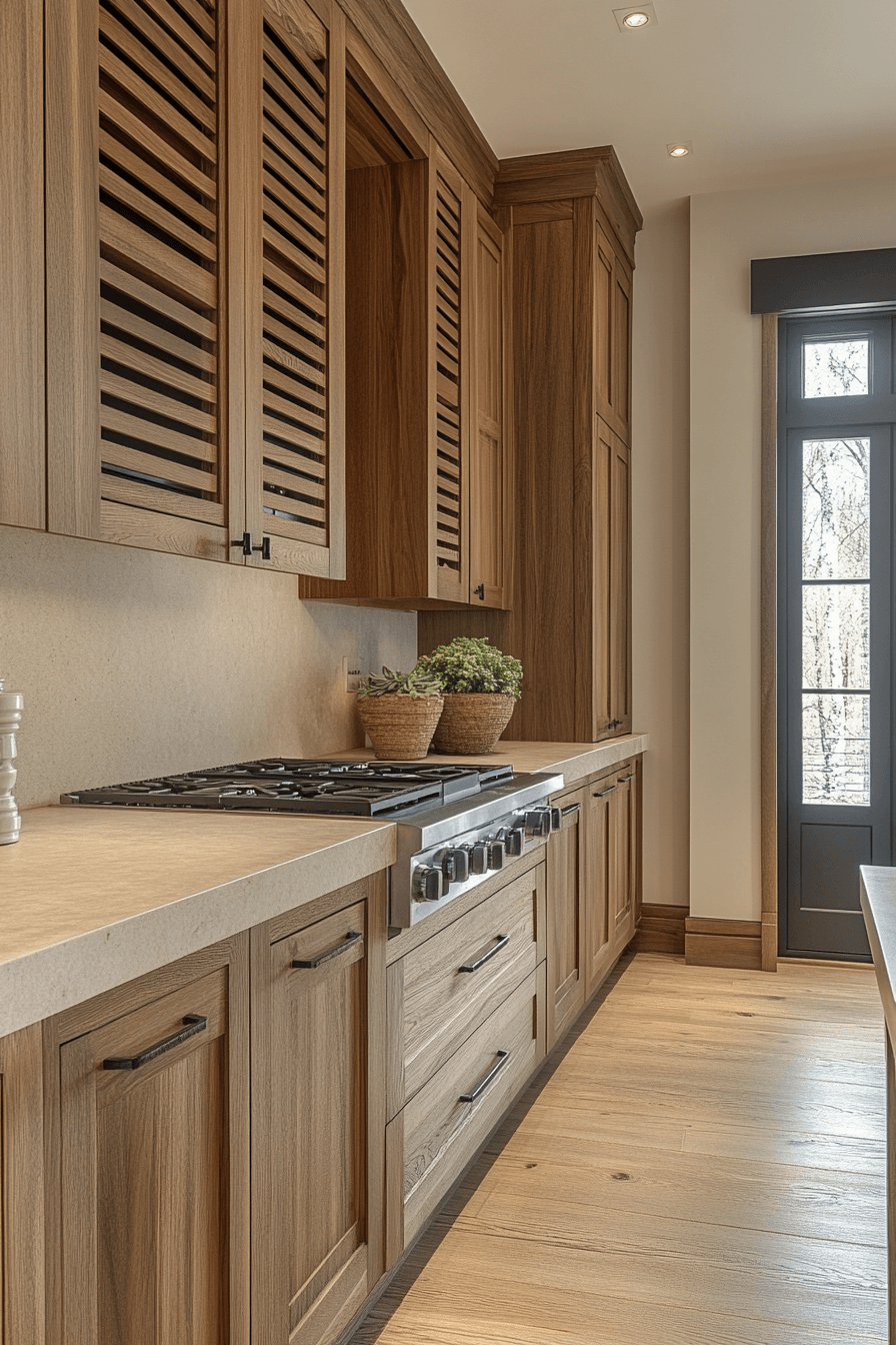 Slatted cabinet fronts add architectural rhythm to rustic kitchen cabinets. Vertical or horizontal lines create texture and movement. This design blends beautifully with Japandi or modern farmhouse styles. Natural finishes enhance depth without overwhelming the space. The look feels structured and organic. Explore slatted rustic kitchen cabinets with modern character.