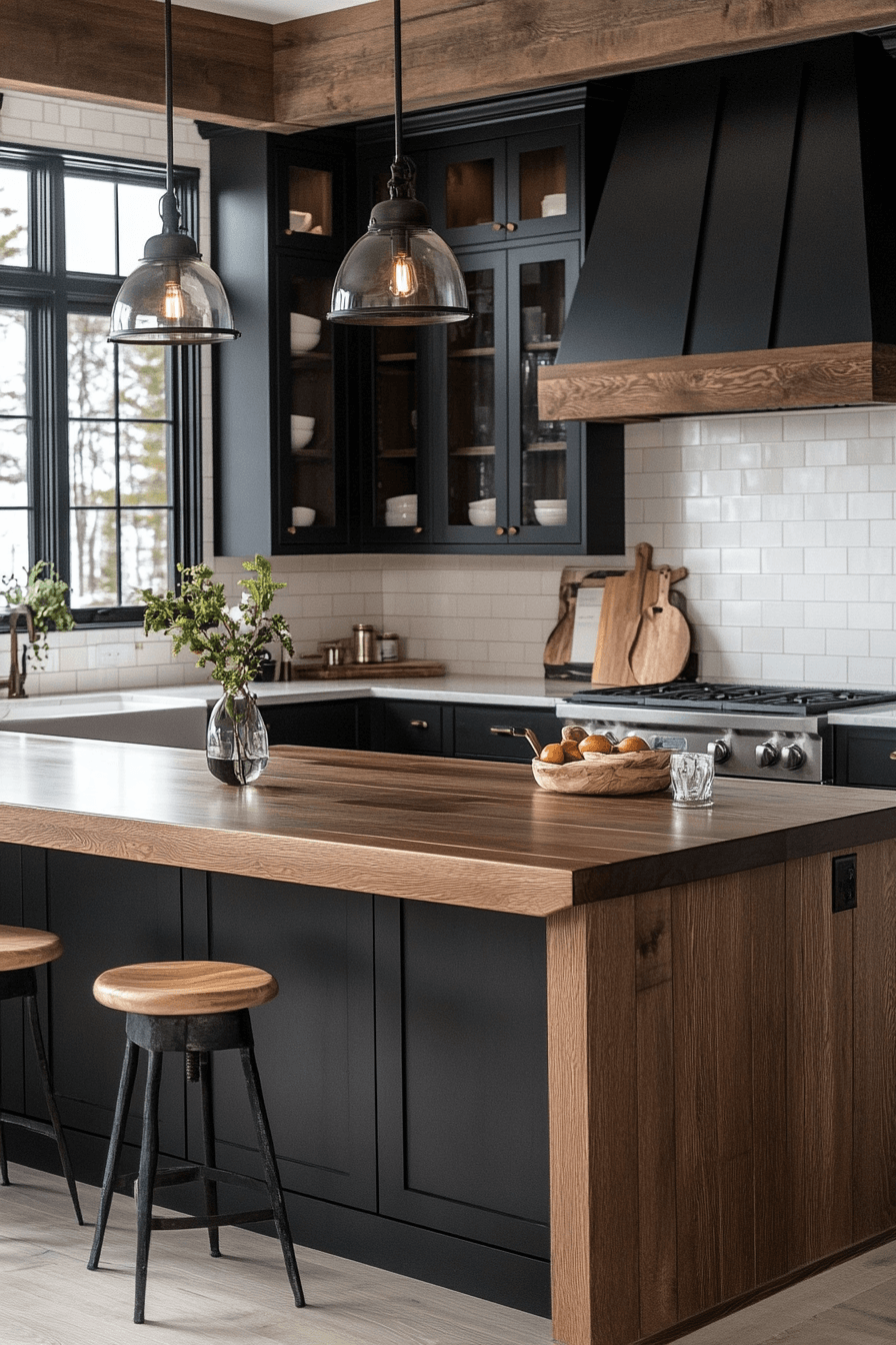 - Lighting: Matte black pendant lights with Edison bulbs over island, matching black sconces flanking range hood
