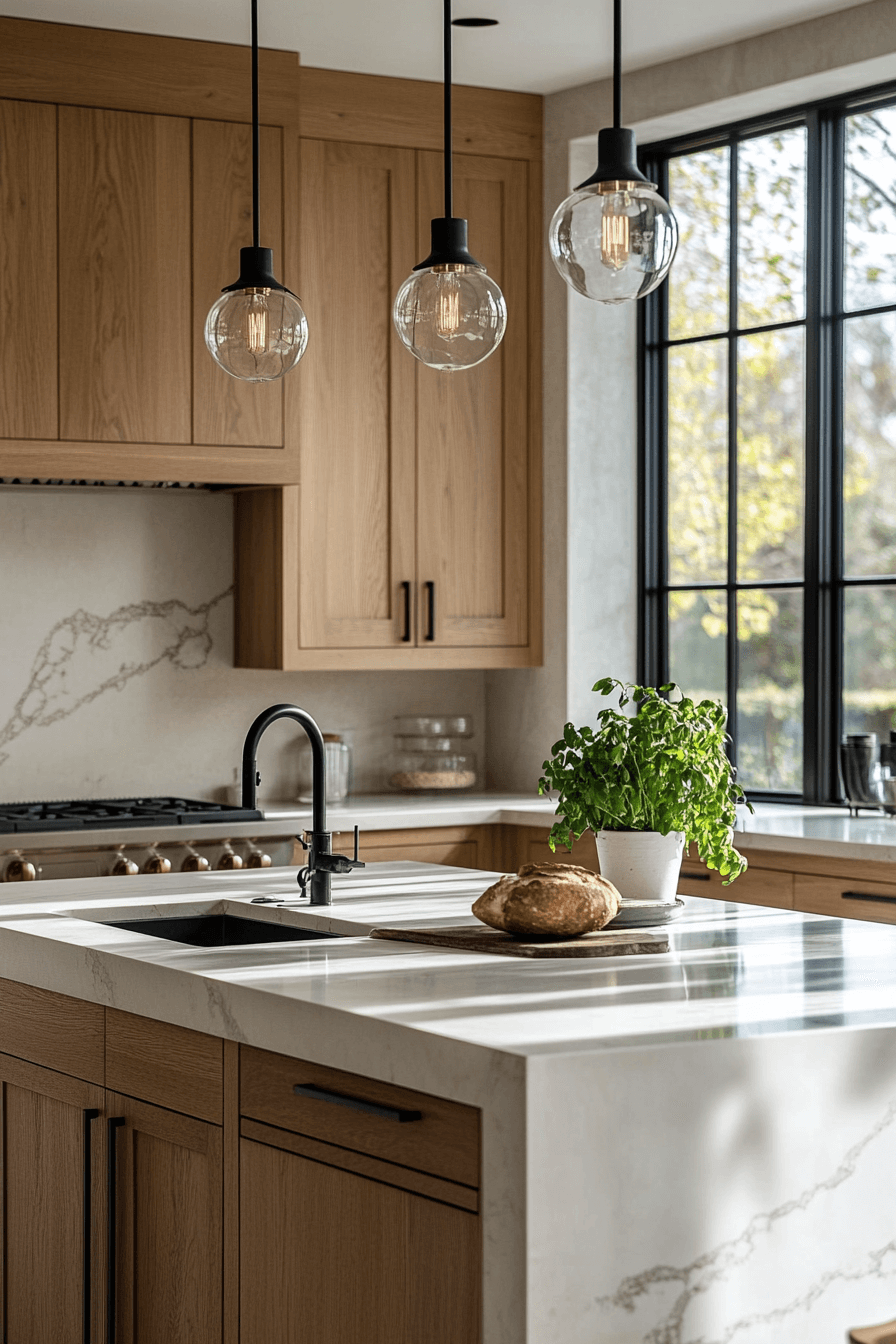 - Lighting: oversized matte black pendant lights with exposed Edison bulbs, under-cabinet LED strips