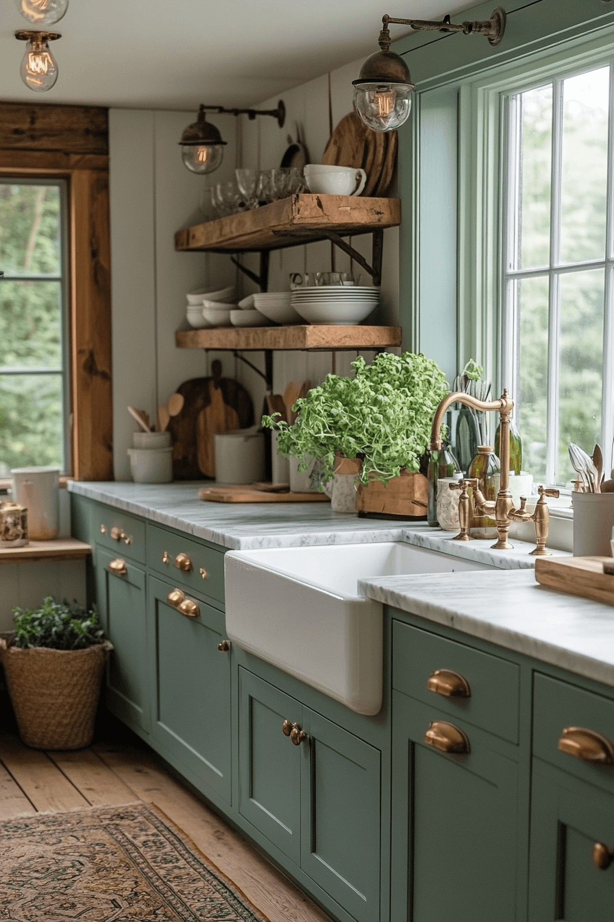 This is the kitchen that smells like rosemary and slow-simmered sauce—earthy green cabinets feel like they grew right out of the garden outside your window.