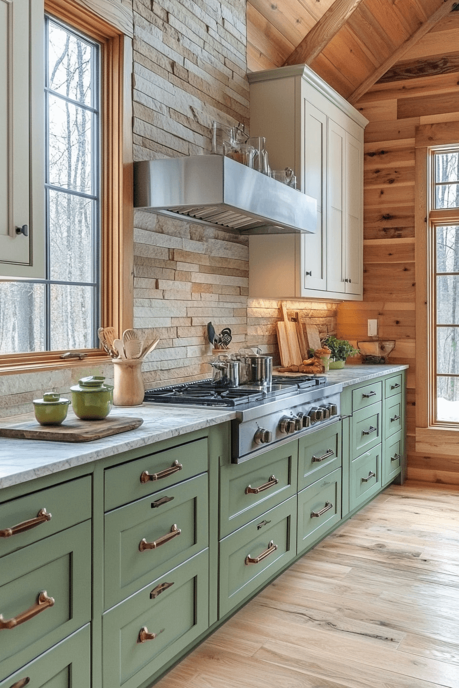 Earth-inspired green hues bring natural vitality to rustic kitchen cabinets while maintaining a grounded aesthetic. Shades like sage, olive, and forest green blend effortlessly with warm wood textures. These colors evoke countryside calm and pair beautifully with brass hardware and stone finishes. The look feels fresh without losing its rustic soul. Green tones add life and warmth to the heart of the home. Explore rustic kitchen cabinets in calming green palettes.