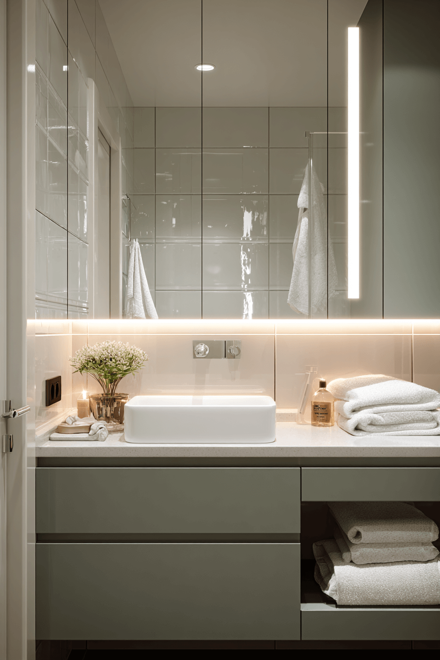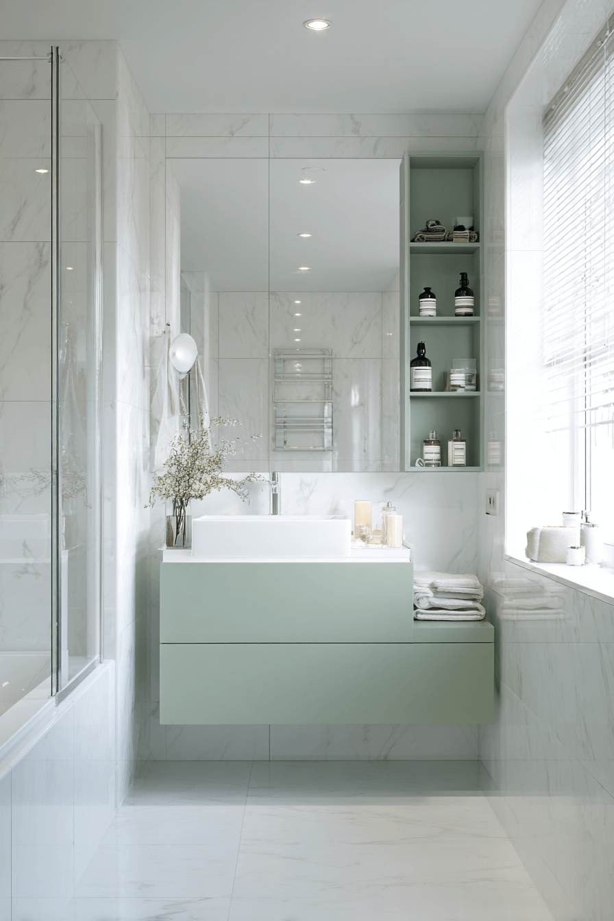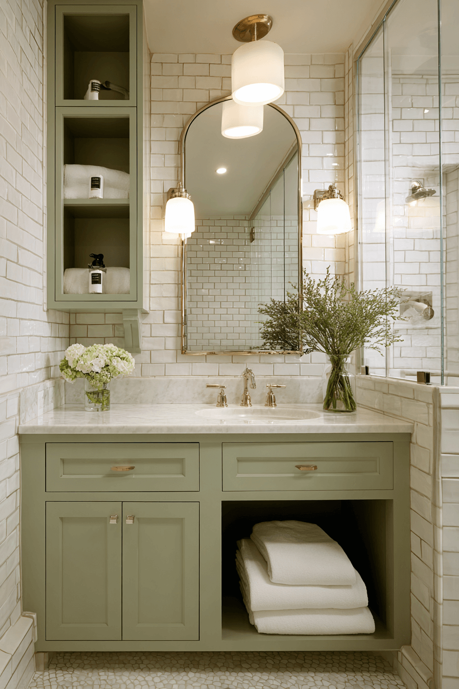Natural light enhances this combination beautifully. A sage green and white bathroom sparkles during the day as white amplifies brightness and sage adds warmth. Even small sage accents feel impactful against white tile. The mood is uplifting yet grounded. It’s cheerful without being loud. Tap to brighten your bathroom effortlessly!