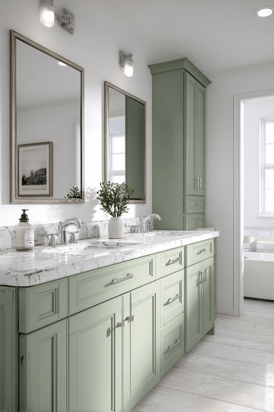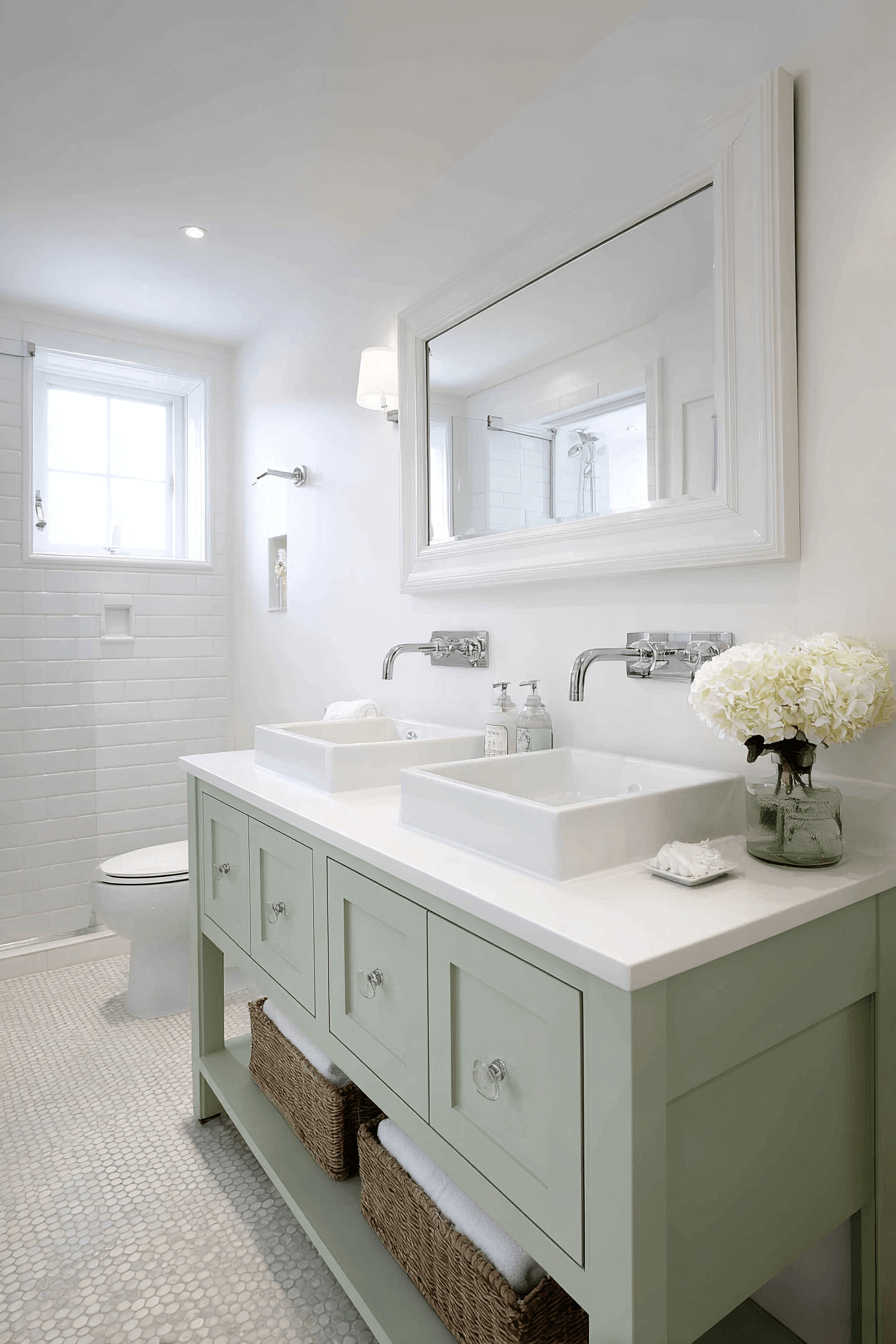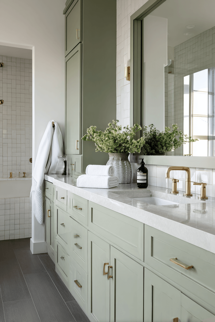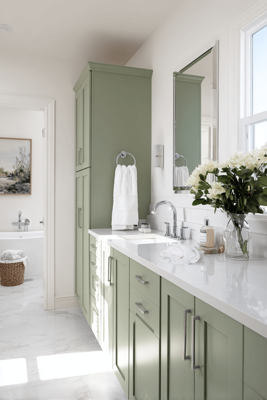 Architectural details stand out in this crisp combination. A sage green and white bathroom highlights clean lines because white defines structure and sage softens edges. Flat-panel cabinetry and geometric mirrors feel strong yet warm. The design reads modern but never harsh. It’s structured without feeling cold. Click to achieve this sleek architectural finish!